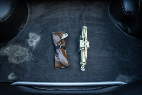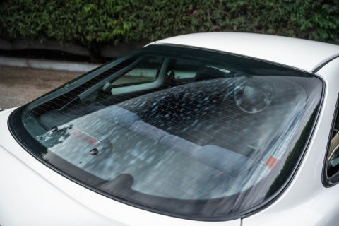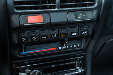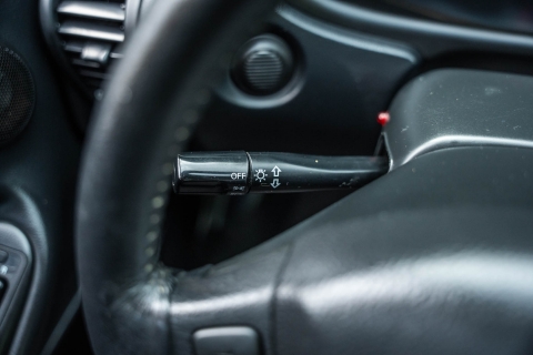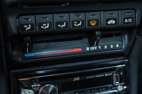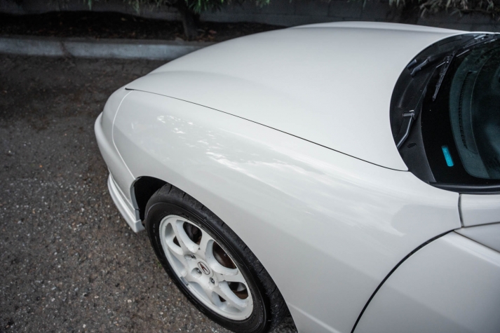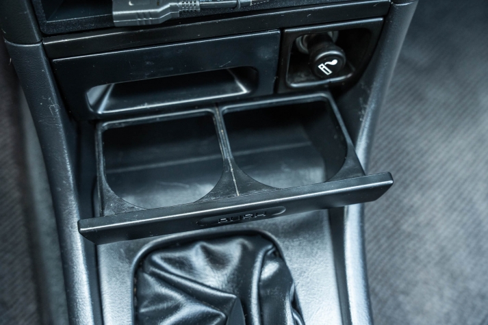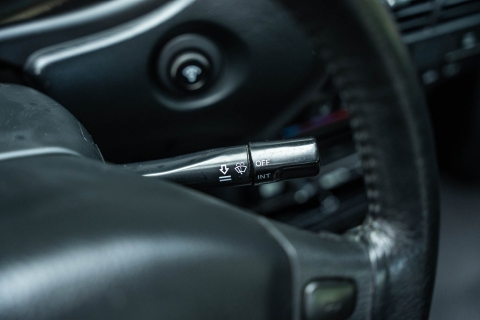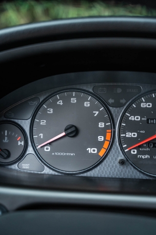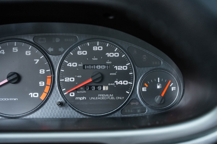 The four-spoke leather-wrapped steering wheel frames a 150-mph speedometer and a tachometer with an 8,400-rpm redline as well as gauges for coolant temperature and fuel level. The six-digit odometer shows 112k miles, approximately 110k of which were added under current ownership.