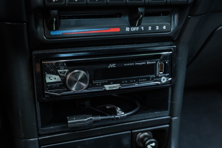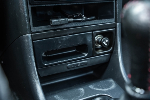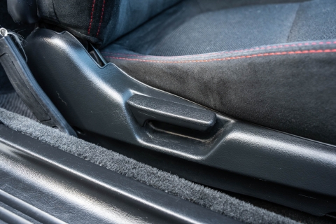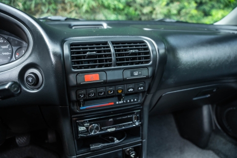 The seating surfaces are upholstered in black microsuede and cloth with red accent stitching and are complemented by a color-matching center console, door panels, and carpets. Amenities include a JVC stereo, a digital clock, and power windows and locks. There is a stain on the cargo area carpet.