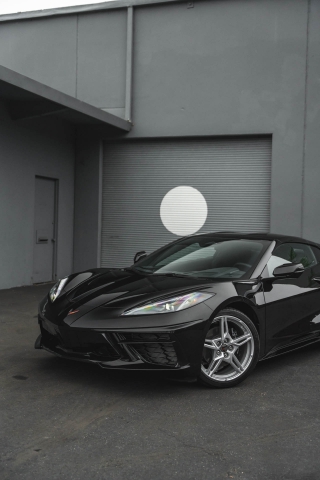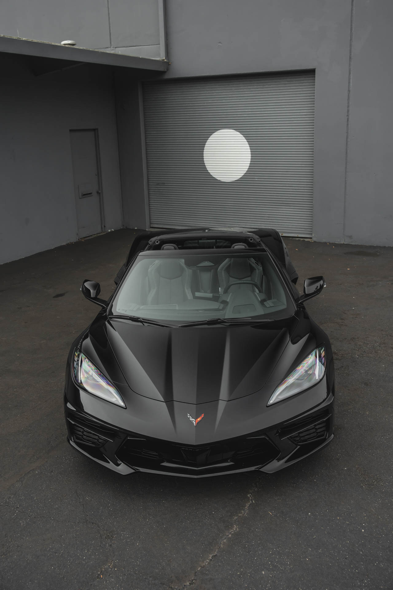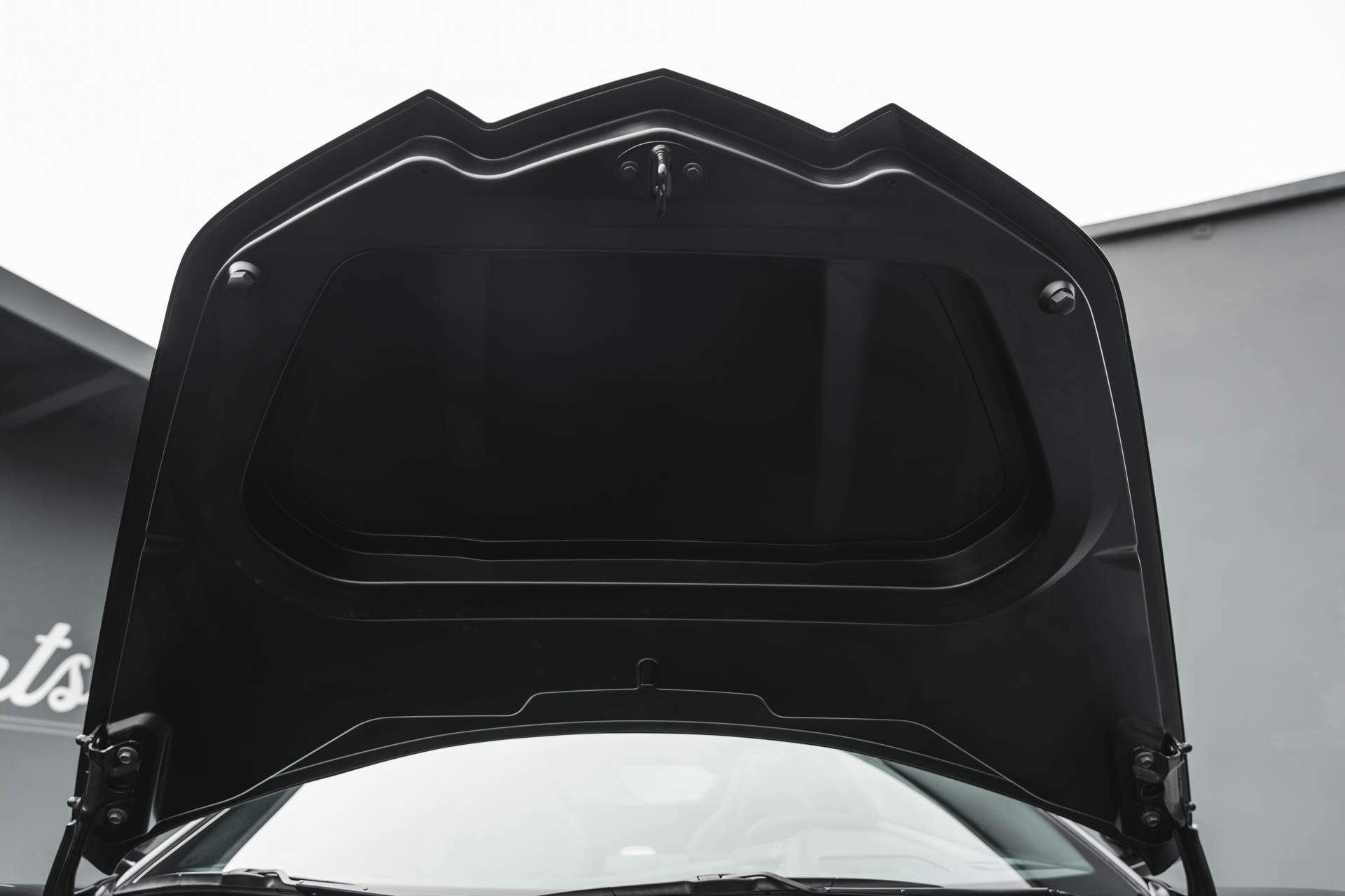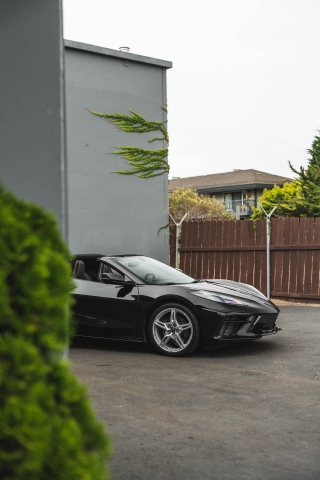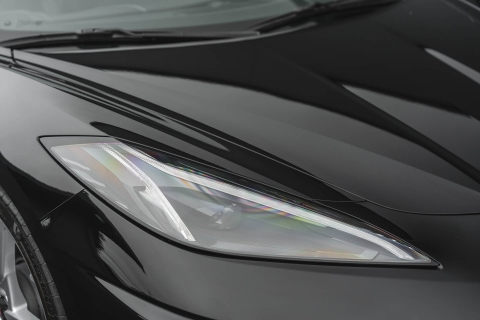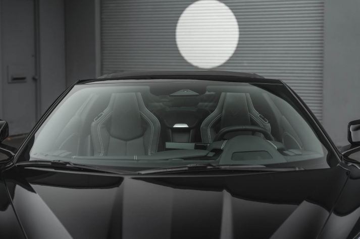 The car is finished in black and has LED headlights, side air intakes, a front splitter, a backup camera, a removable roof panel, LED headlights, and rear parking sensors.
