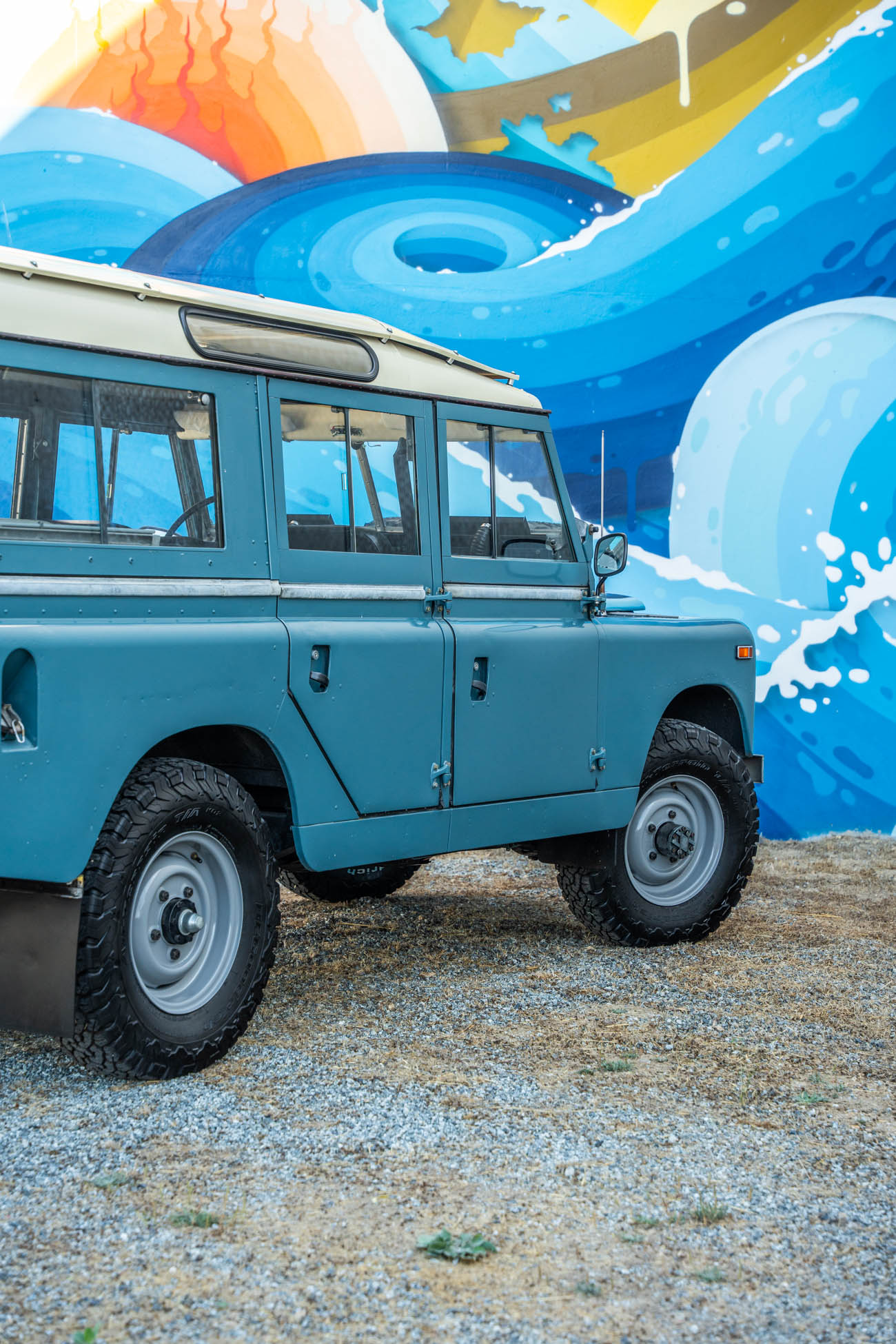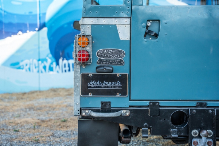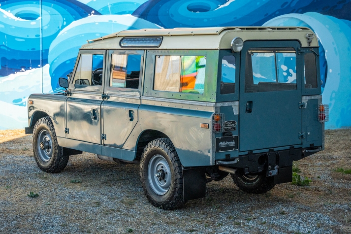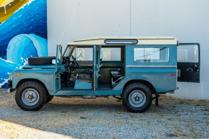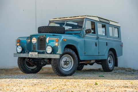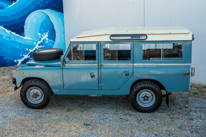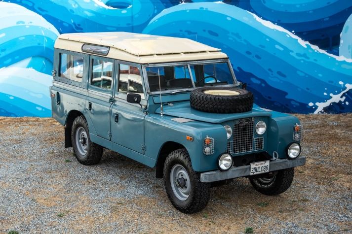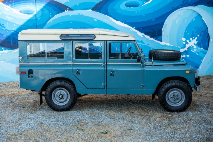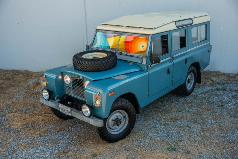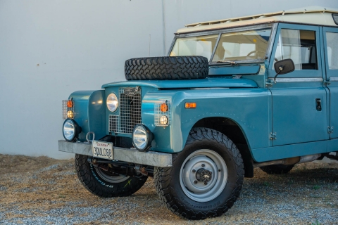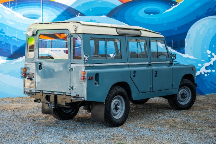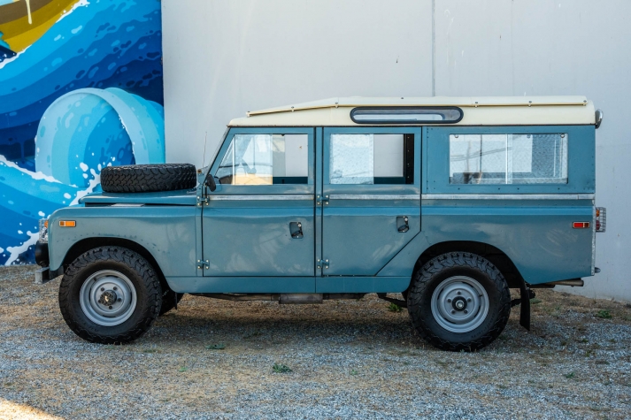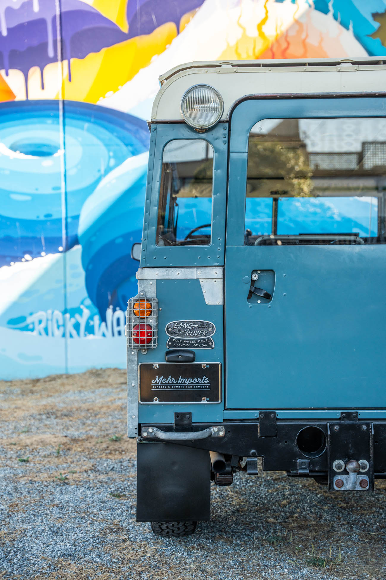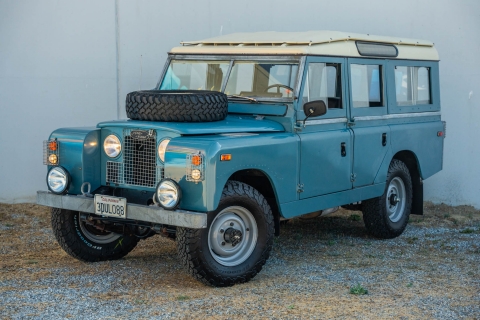 This 1968 Land Rover 109 Series IIA is a left-hand-drive station wagon powered by a 2.3-liter inline-four linked to a four-speed manual transmission and a dual-range transfer case. It is finished in blue over black vinyl upholstery and is equipped with a vented tropical roof, a folding windshield, auxiliary lights, sliding side windows, and 16? steel wheels along with three-across front seats, inward-facing jump seats, auxiliary gauges, and a three-spoke steering wheel with a brodie knob. The current owner purchased the truck from the selling dealer in February 2013, and subsequent work included replacing the primary fuel tank, carburetor assembly, linkage, and tires. This 109 is now offered on dealer consignment at no reserve with spare parts, workshop manuals, 2015-2023 service records, and a clean California title.