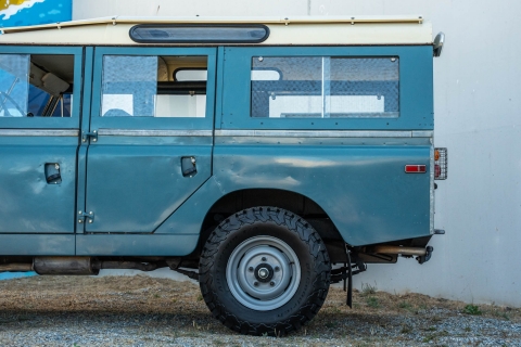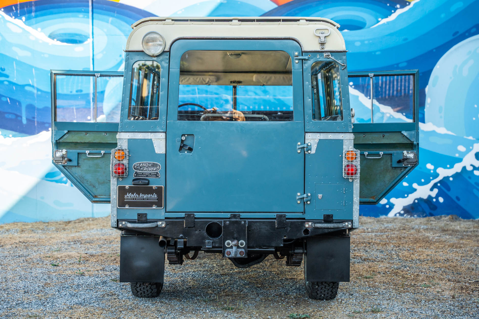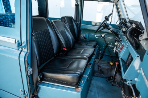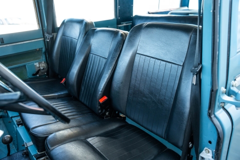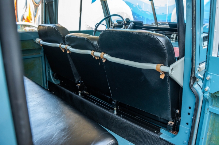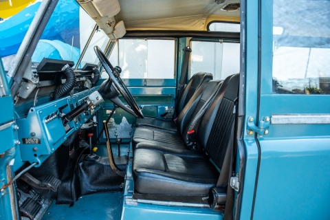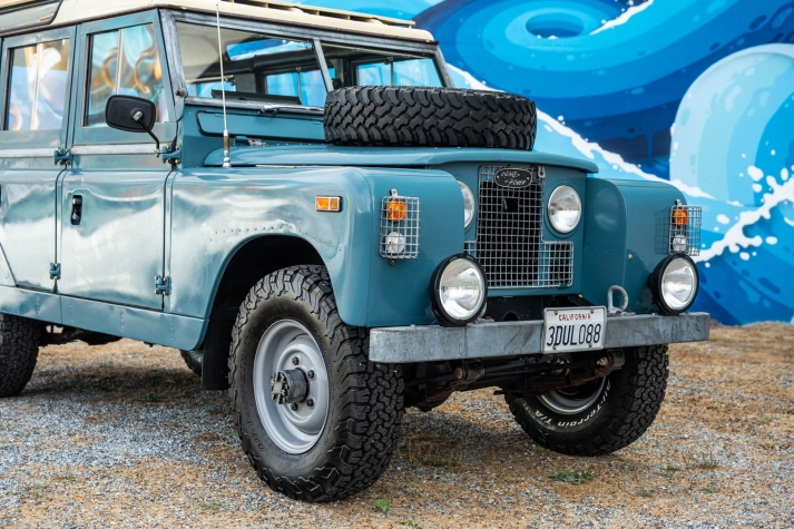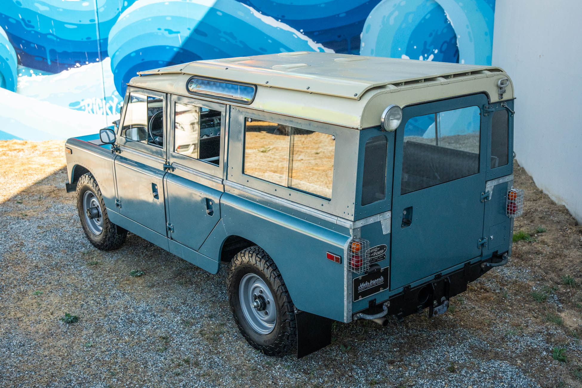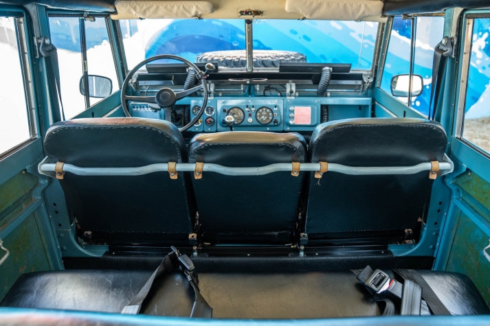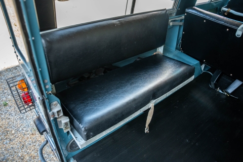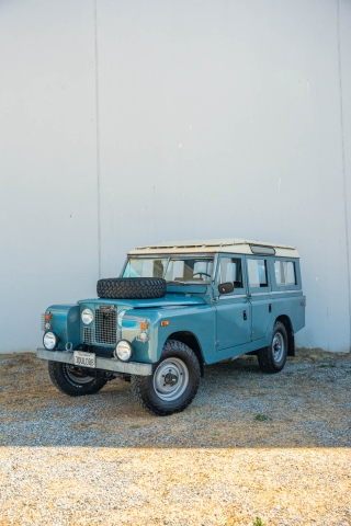 This 1968 Land Rover 109 Series IIA is a left-hand-drive station wagon powered by a 2.3-liter inline-four linked to a four-speed manual transmission and a dual-range transfer case. It is finished in blue over black vinyl upholstery and is equipped with a vented tropical roof, a folding windshield, auxiliary lights, sliding side windows, and 16? steel wheels along with three-across front seats, inward-facing jump seats, auxiliary gauges, and a three-spoke steering wheel with a brodie knob. The current owner purchased the truck from the selling dealer in February 2013, and subsequent work included replacing the primary fuel tank, carburetor assembly, linkage, and tires. This 109 is now offered on dealer consignment at no reserve with spare parts, workshop manuals, 2015-2023 service records, and a clean California title.