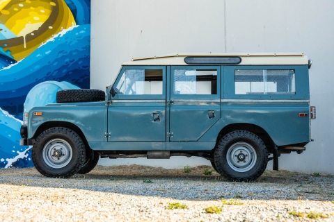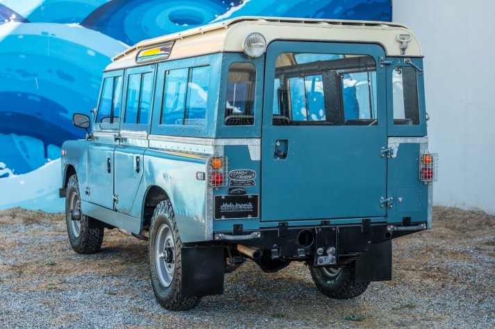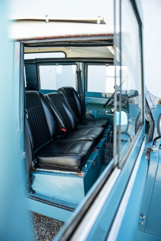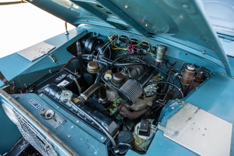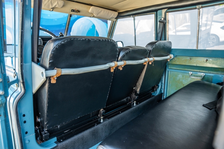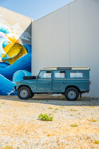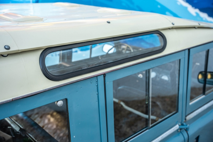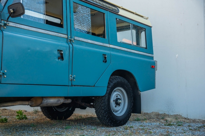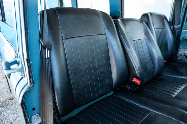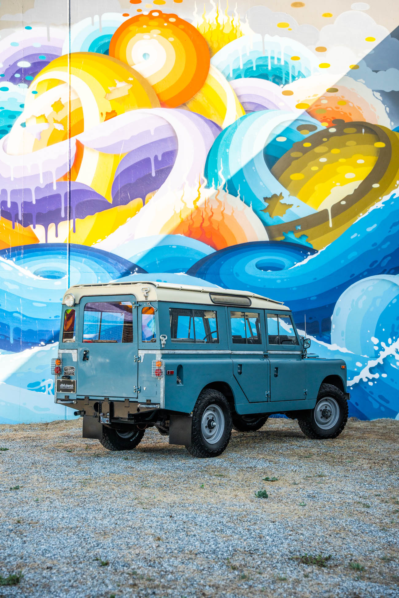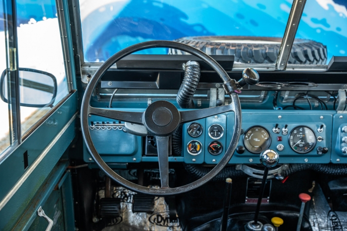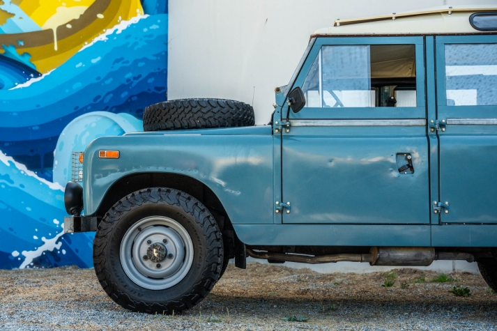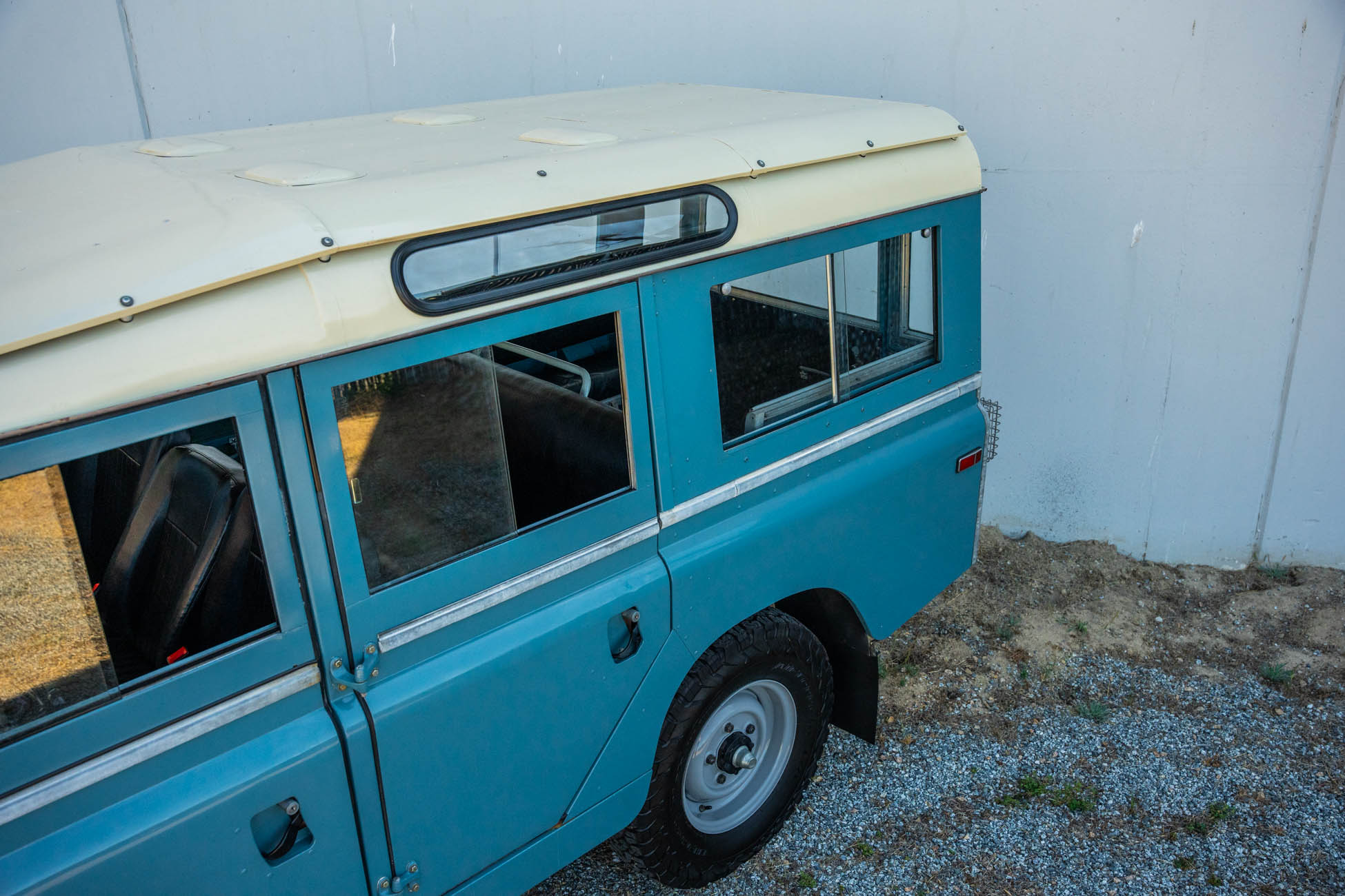 This 1968 Land Rover 109 Series IIA is a left-hand-drive station wagon powered by a 2.3-liter inline-four linked to a four-speed manual transmission and a dual-range transfer case. It is finished in blue over black vinyl upholstery and is equipped with a vented tropical roof, a folding windshield, auxiliary lights, sliding side windows, and 16? steel wheels along with three-across front seats, inward-facing jump seats, auxiliary gauges, and a three-spoke steering wheel with a brodie knob. The current owner purchased the truck from the selling dealer in February 2013, and subsequent work included replacing the primary fuel tank, carburetor assembly, linkage, and tires. This 109 is now offered on dealer consignment at no reserve with spare parts, workshop manuals, 2015-2023 service records, and a clean California title.