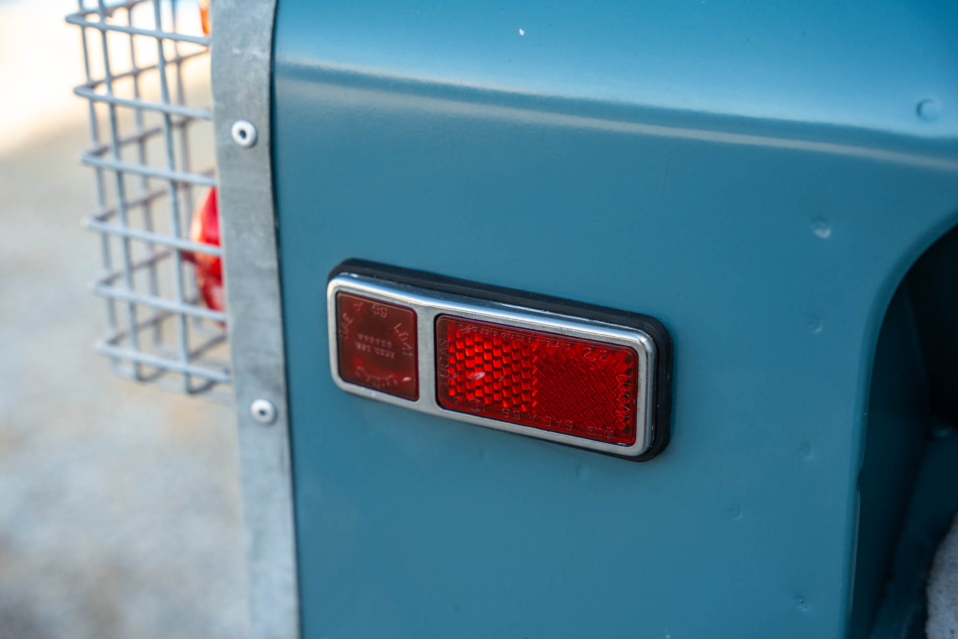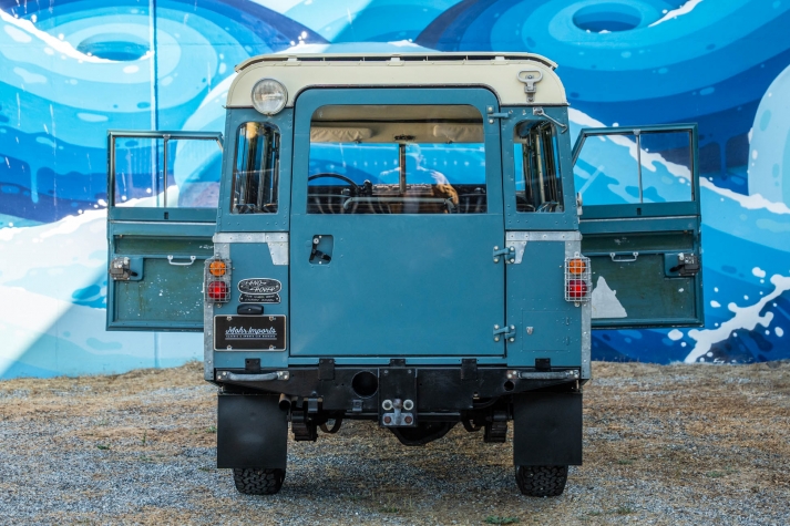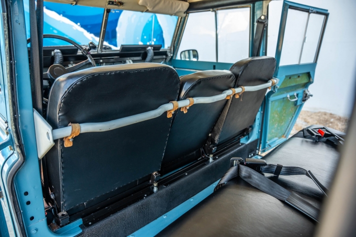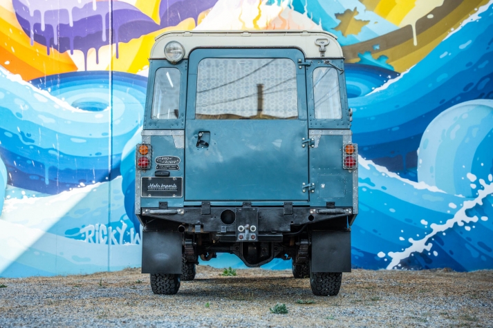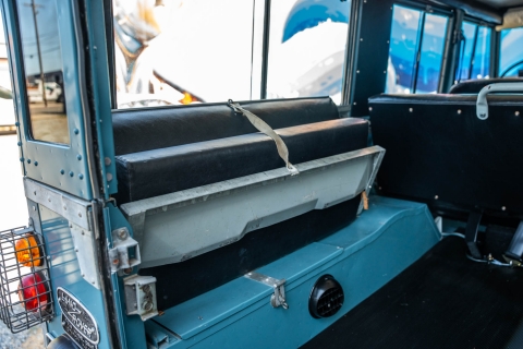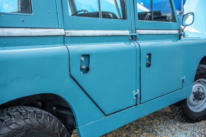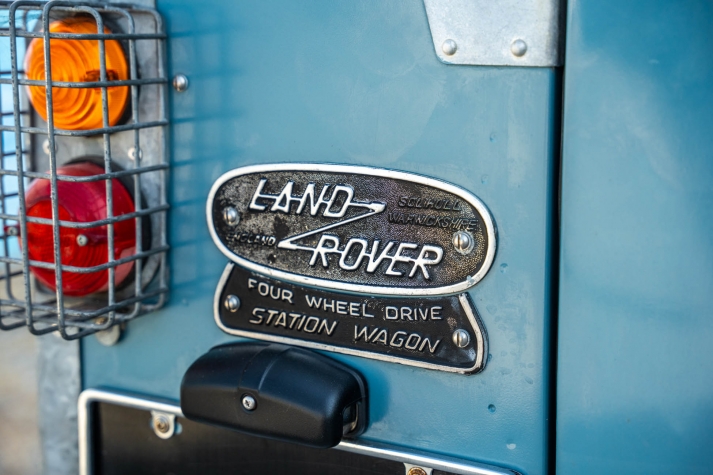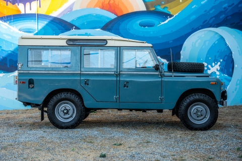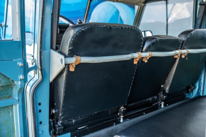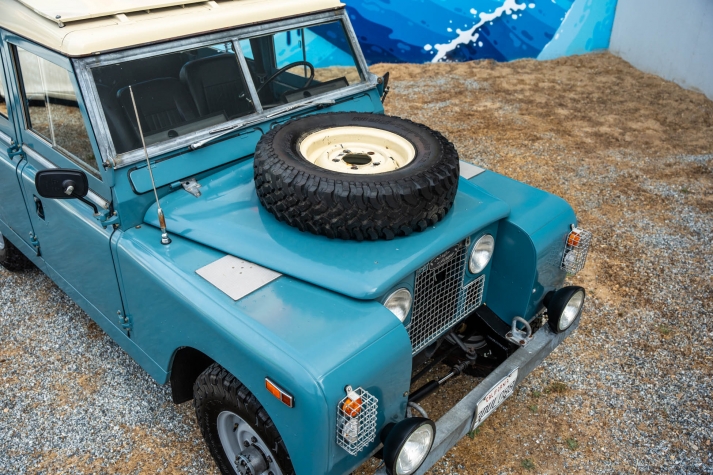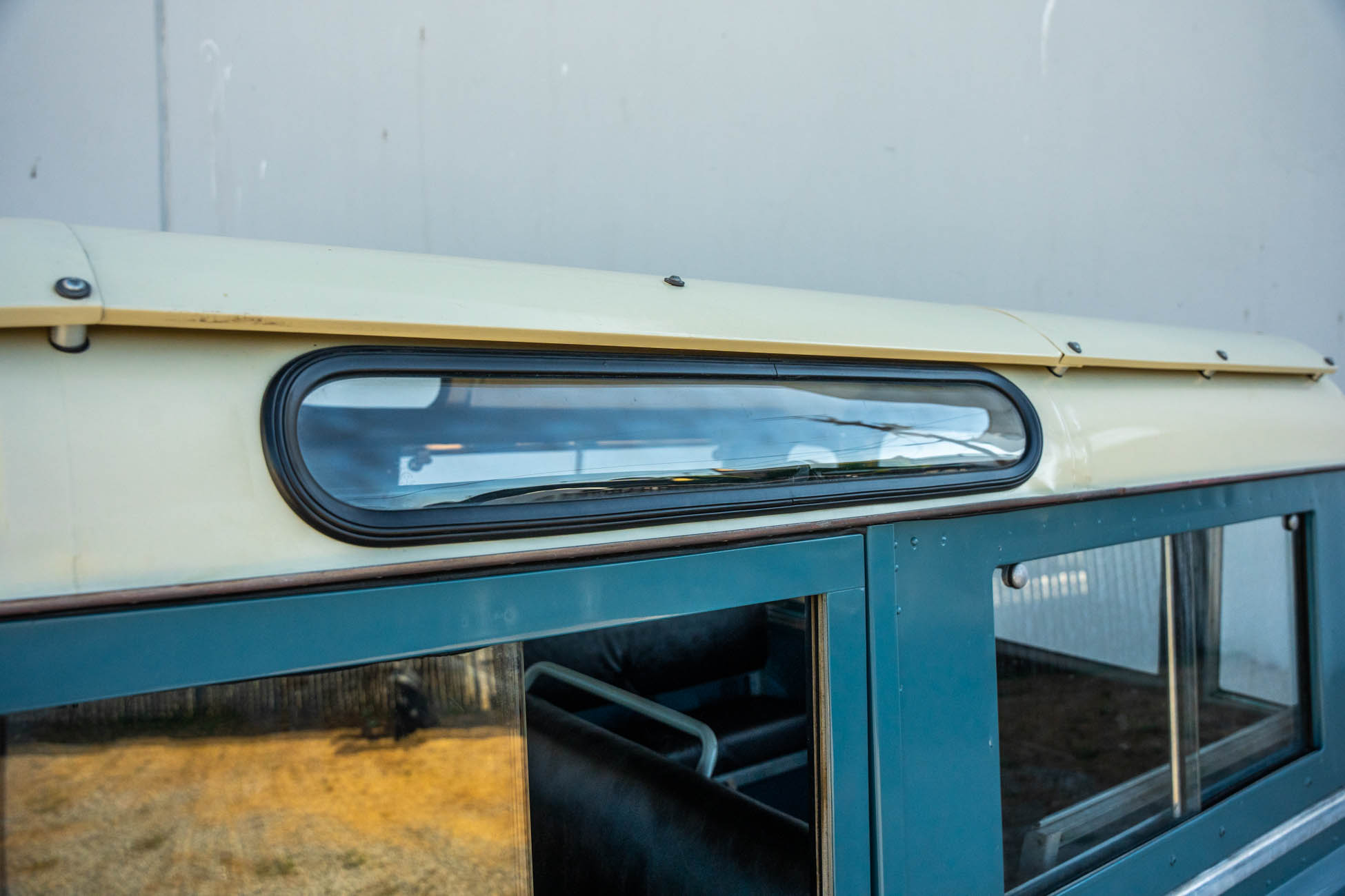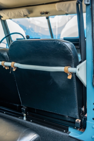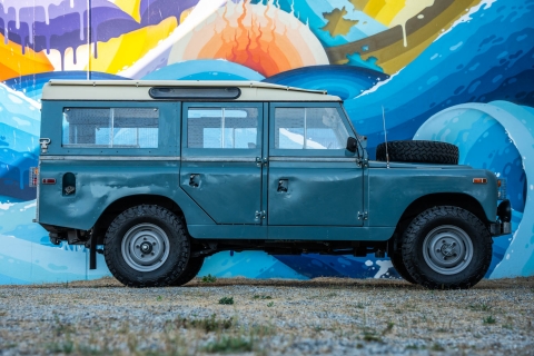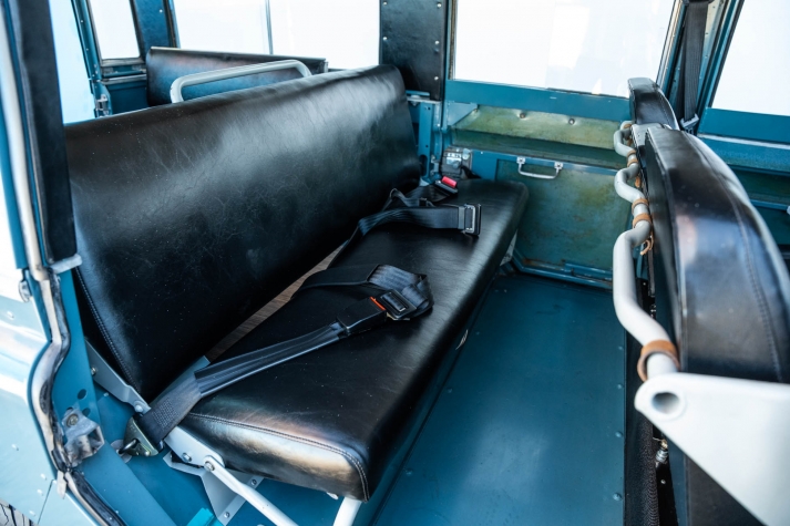 This 1968 Land Rover 109 Series IIA is a left-hand-drive station wagon powered by a 2.3-liter inline-four linked to a four-speed manual transmission and a dual-range transfer case. It is finished in blue over black vinyl upholstery and is equipped with a vented tropical roof, a folding windshield, auxiliary lights, sliding side windows, and 16? steel wheels along with three-across front seats, inward-facing jump seats, auxiliary gauges, and a three-spoke steering wheel with a brodie knob. The current owner purchased the truck from the selling dealer in February 2013, and subsequent work included replacing the primary fuel tank, carburetor assembly, linkage, and tires. This 109 is now offered on dealer consignment at no reserve with spare parts, workshop manuals, 2015-2023 service records, and a clean California title.