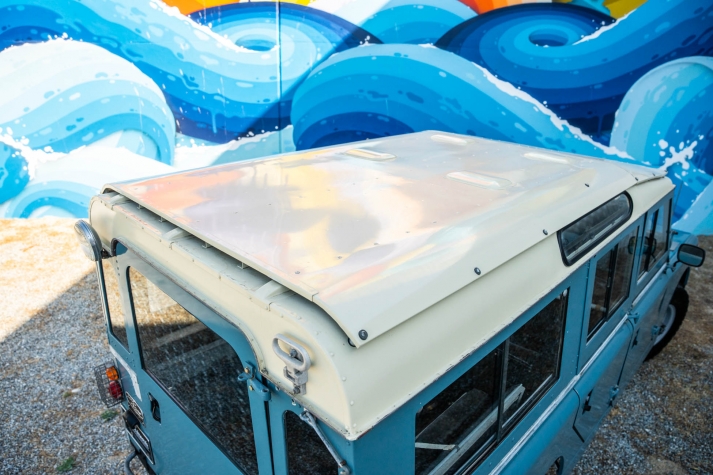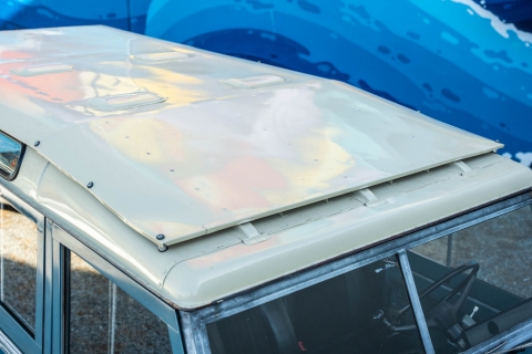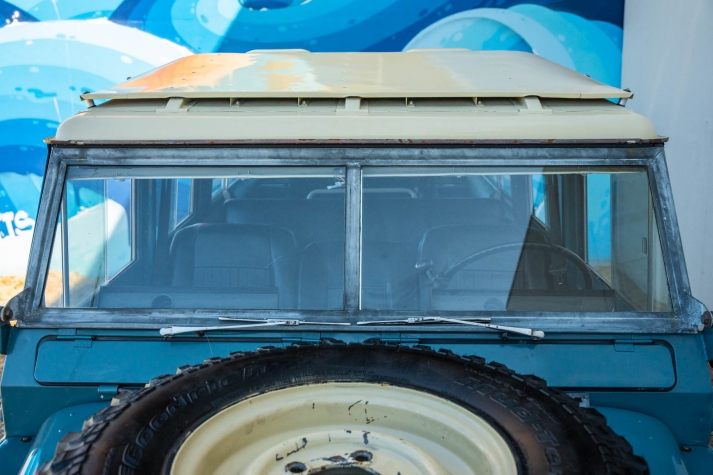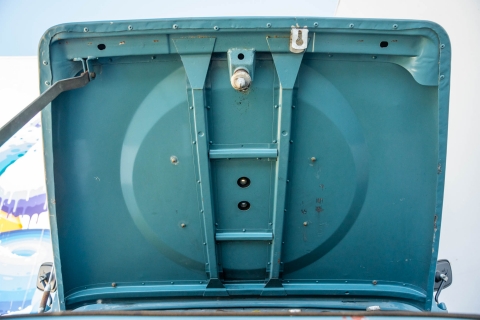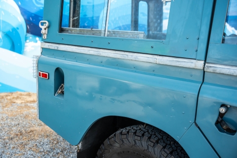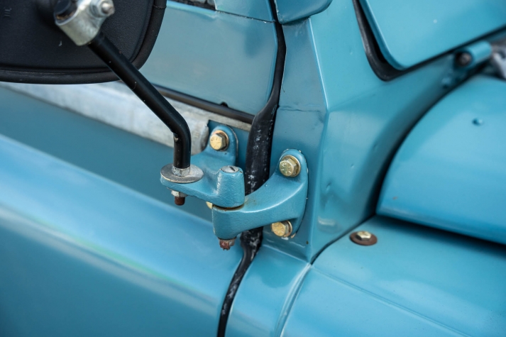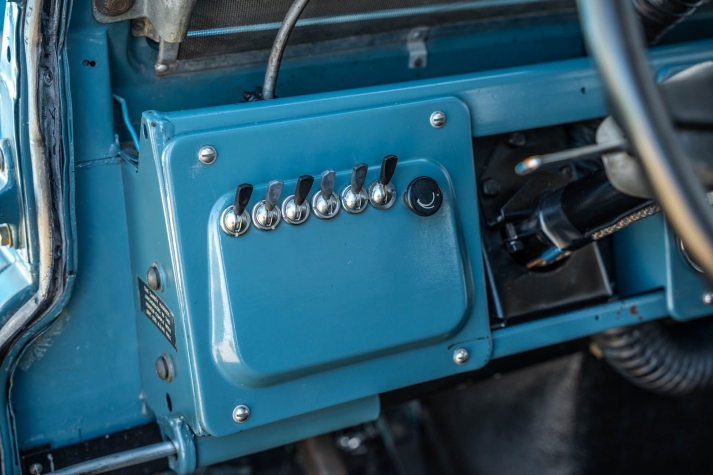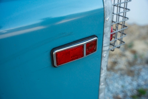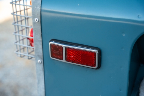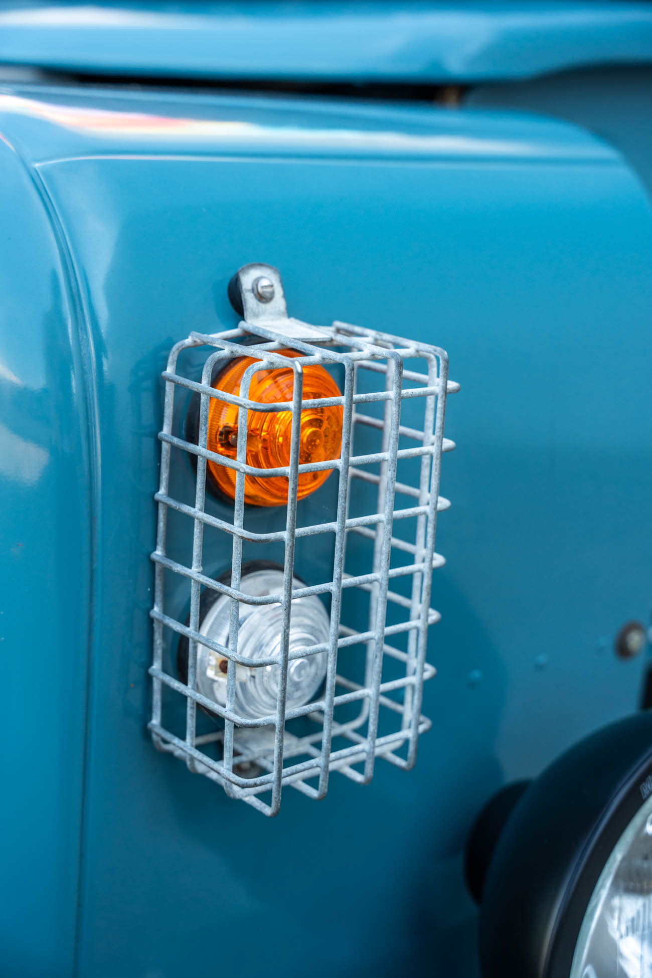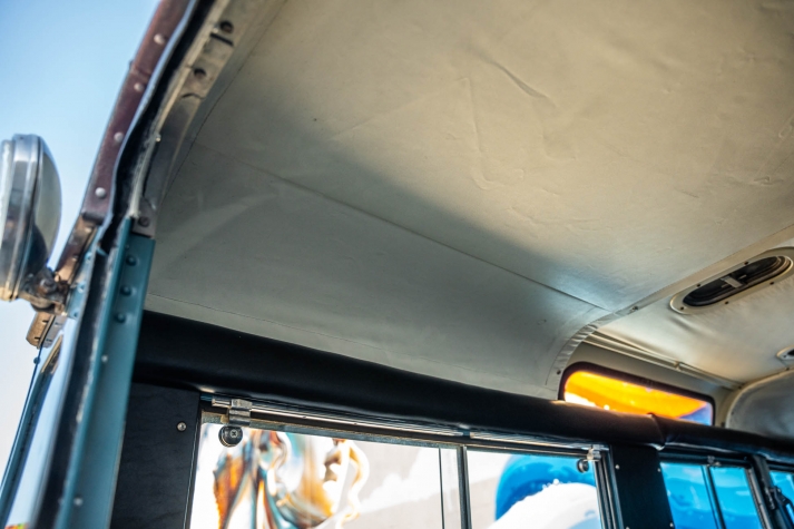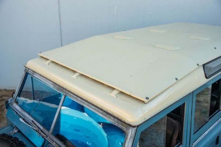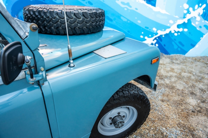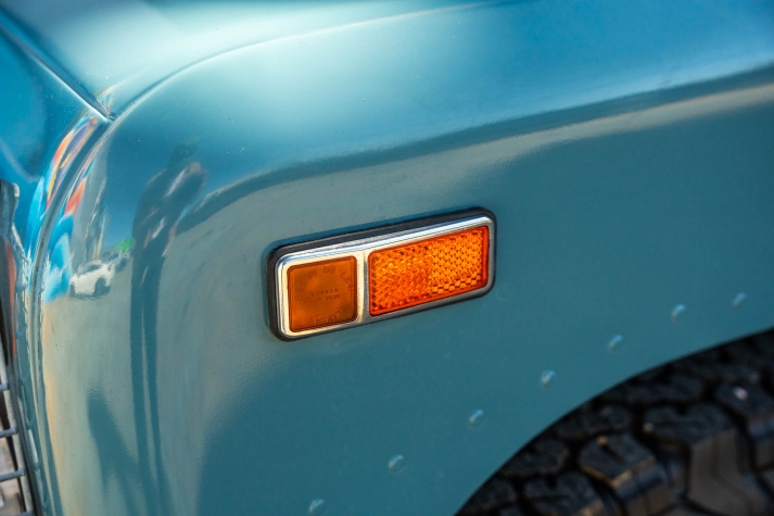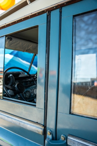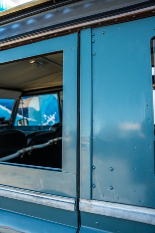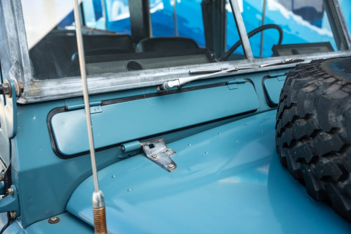 The truck is finished in blue and was repainted at an unknown time. It has a vented tropical roof with alpine windows as well as auxiliary lights, a folding windshield, a side-hinged rear cargo door, cowl vents, sliding side windows, and dual side mirrors. Close-up photos of the exterior are provided in the gallery below.