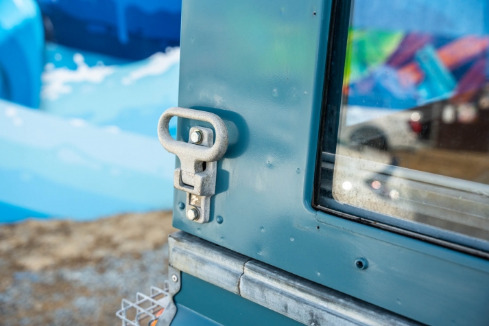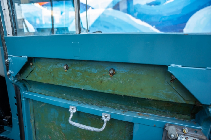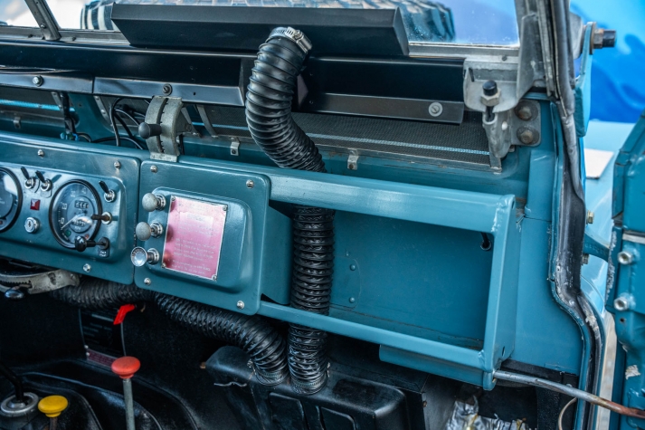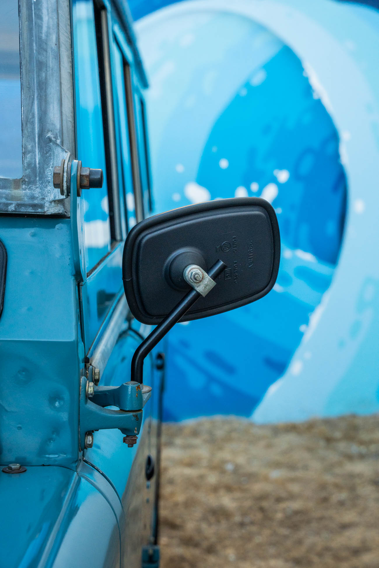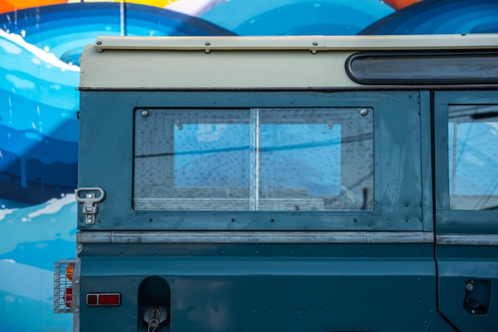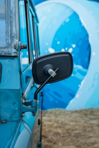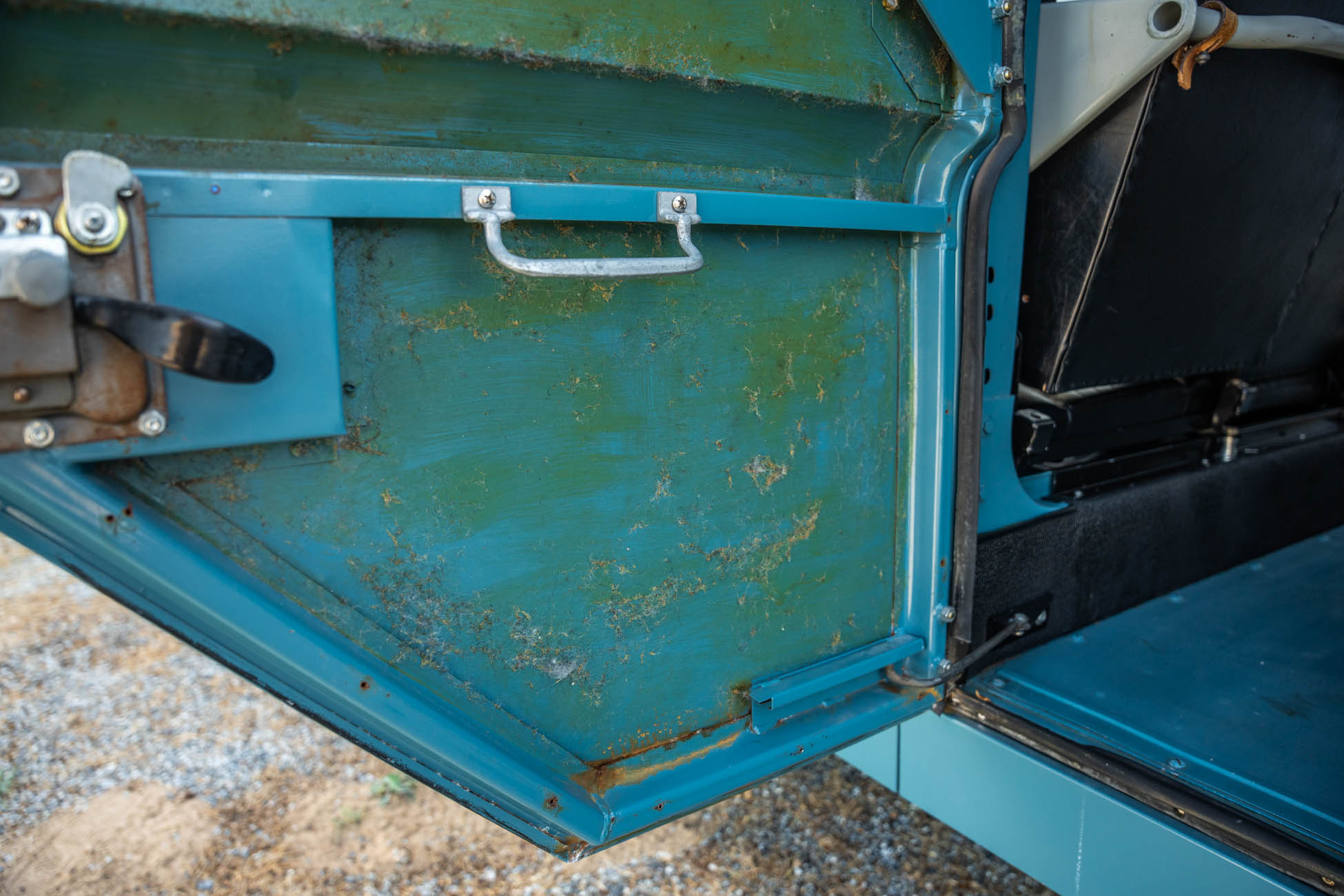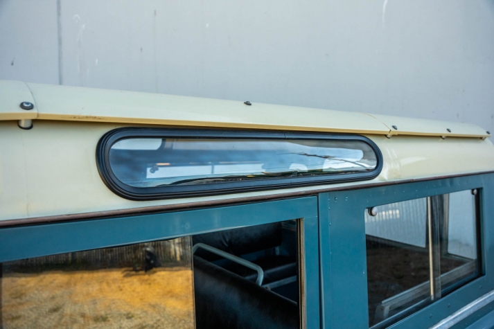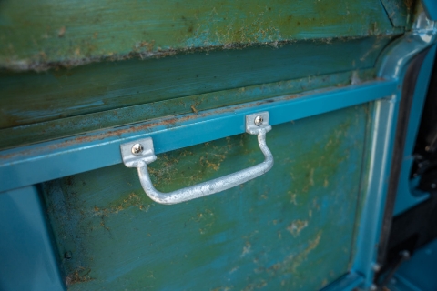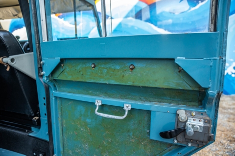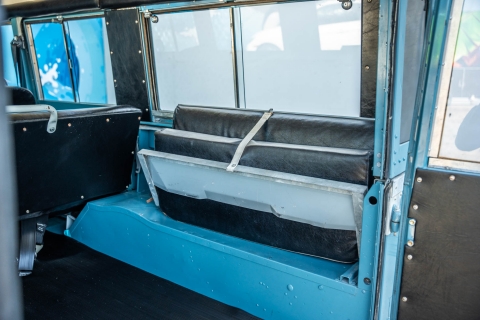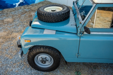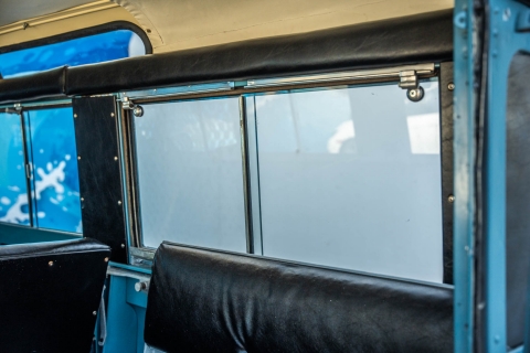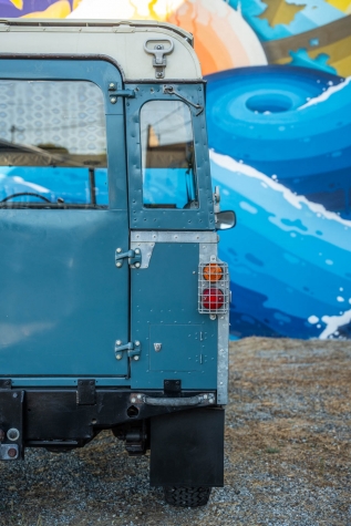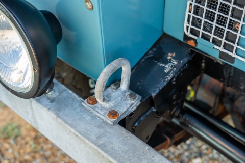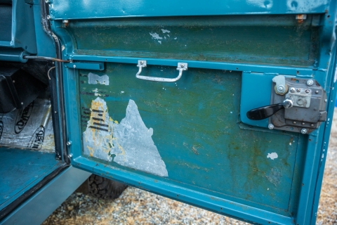 The truck is finished in blue and was repainted at an unknown time. It has a vented tropical roof with alpine windows as well as auxiliary lights, a folding windshield, a side-hinged rear cargo door, cowl vents, sliding side windows, and dual side mirrors. Close-up photos of the exterior are provided in the gallery below.