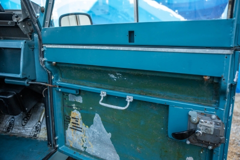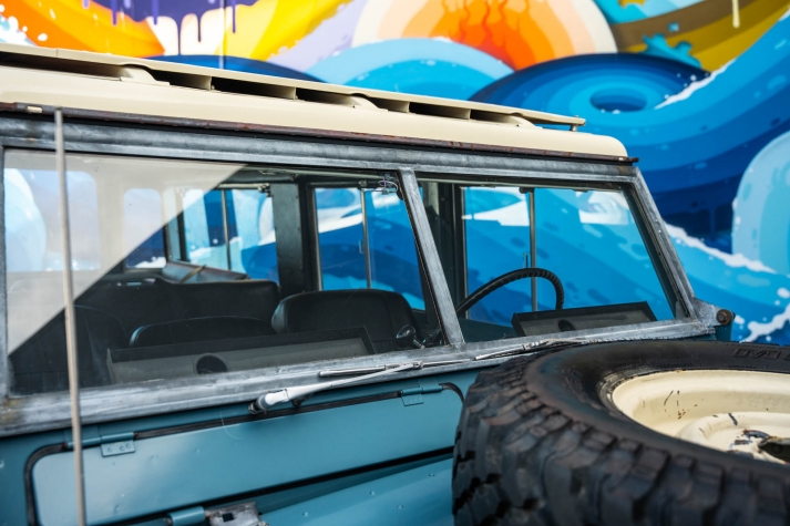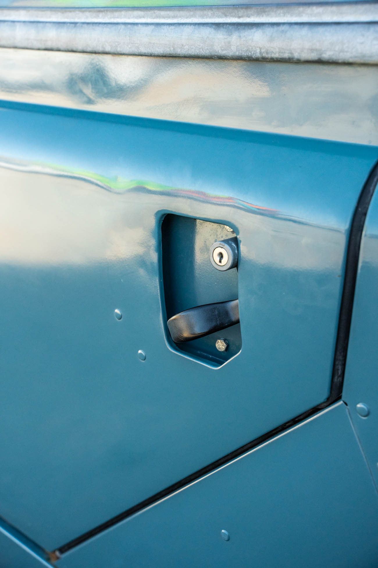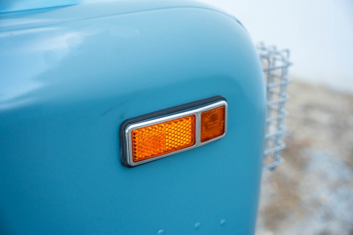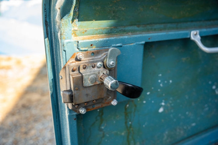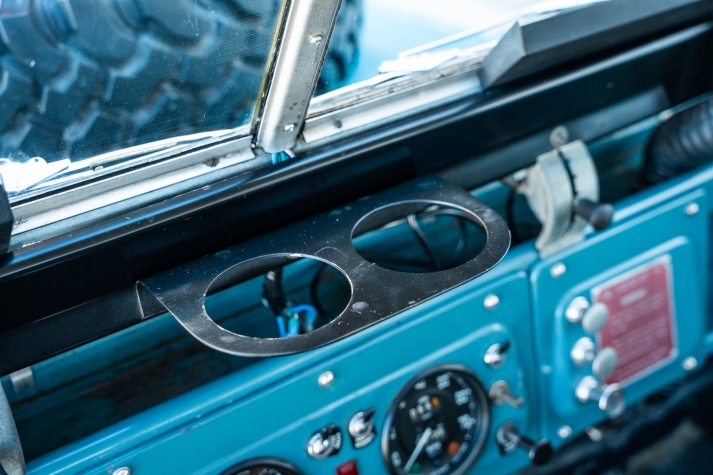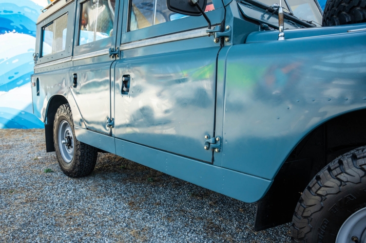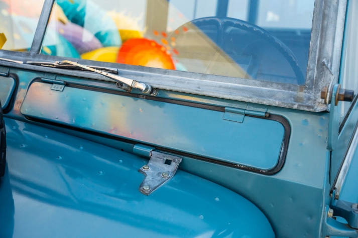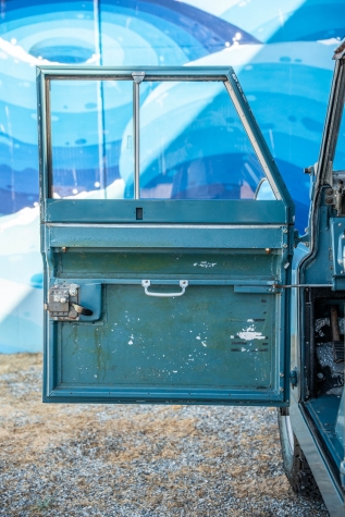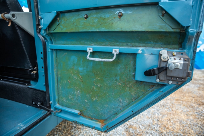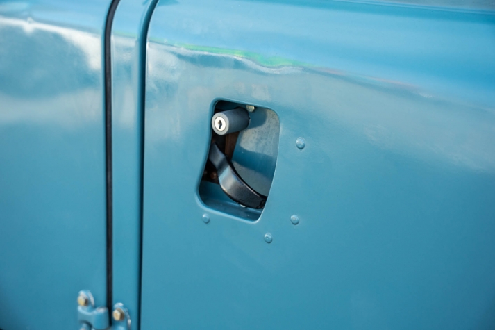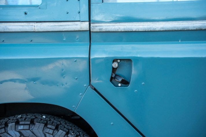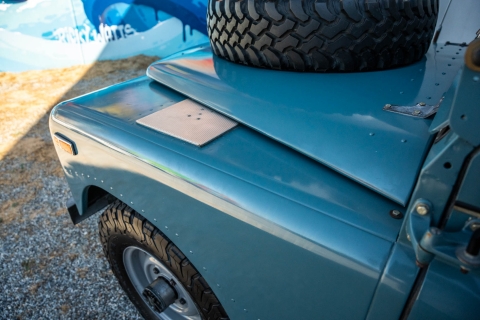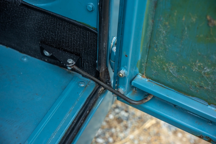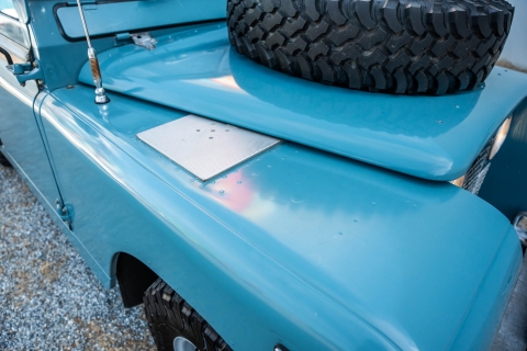 The truck is finished in blue and was repainted at an unknown time. It has a vented tropical roof with alpine windows as well as auxiliary lights, a folding windshield, a side-hinged rear cargo door, cowl vents, sliding side windows, and dual side mirrors. Close-up photos of the exterior are provided in the gallery below.