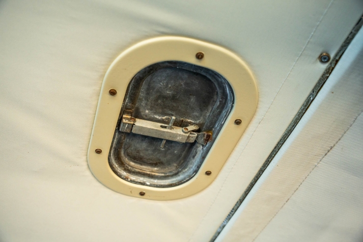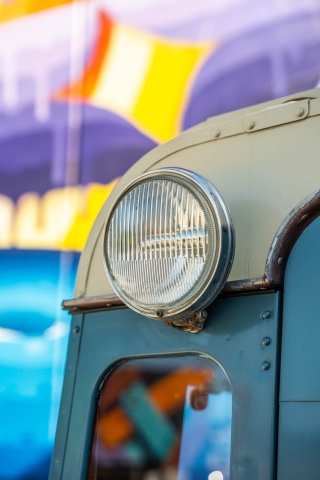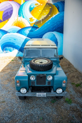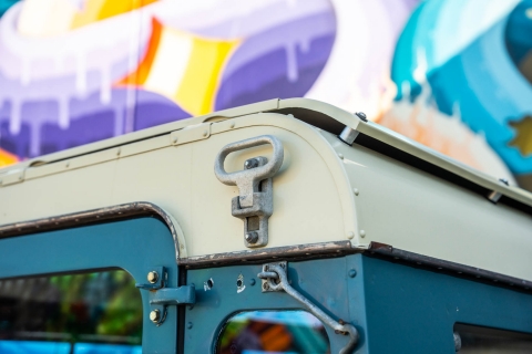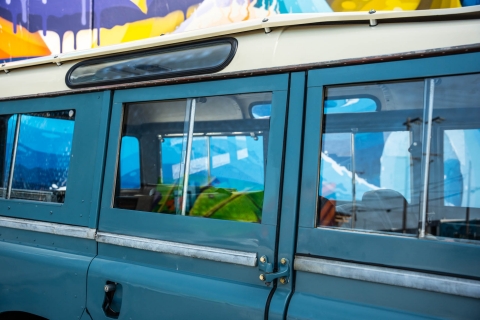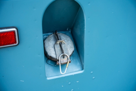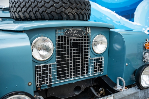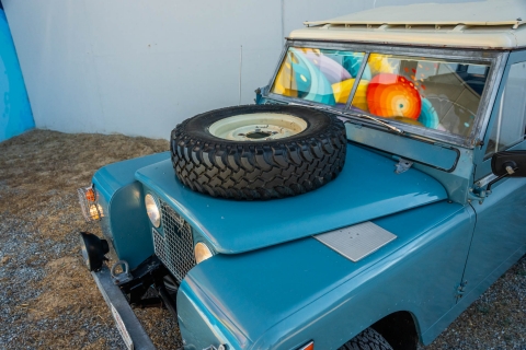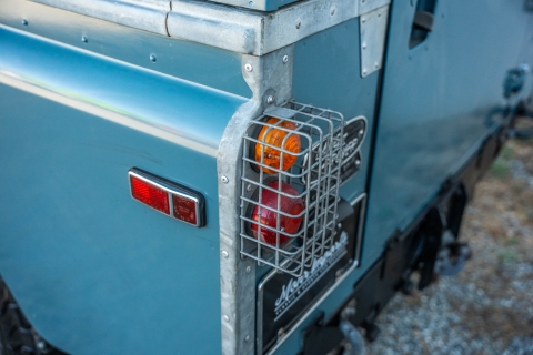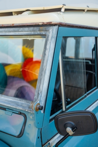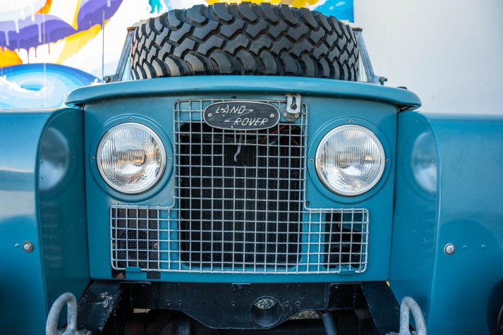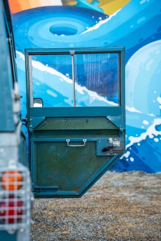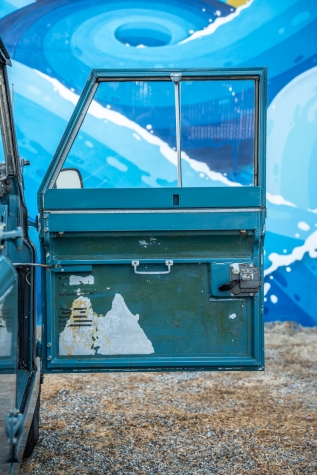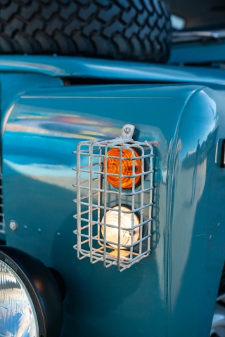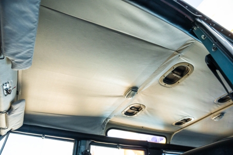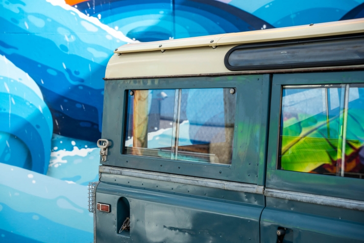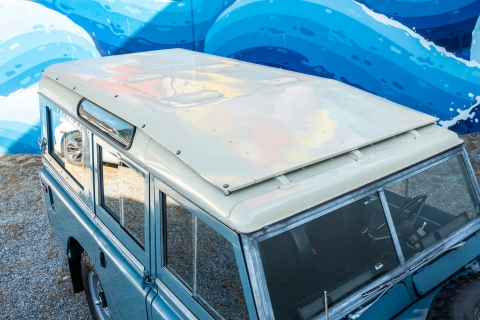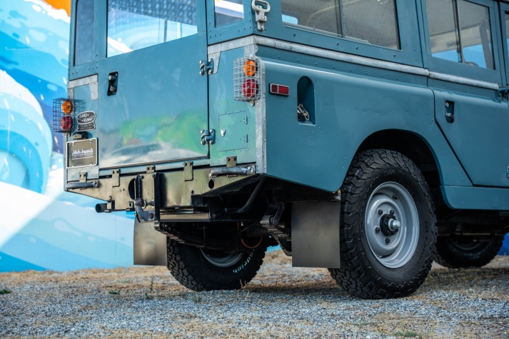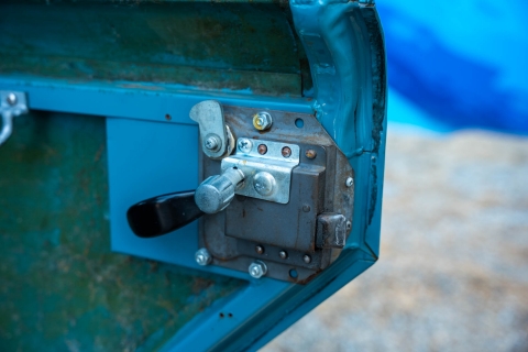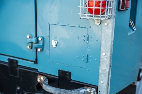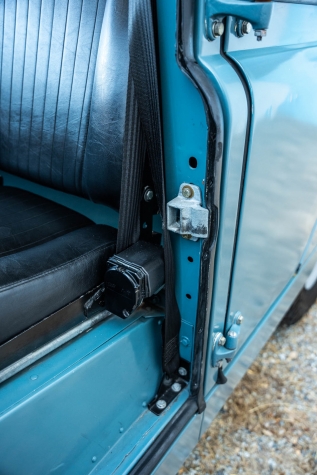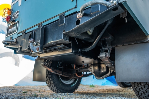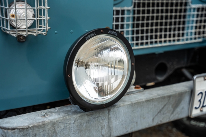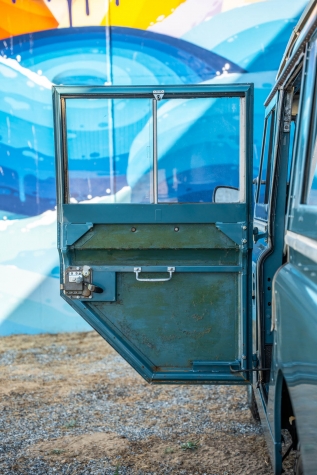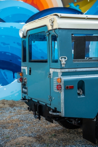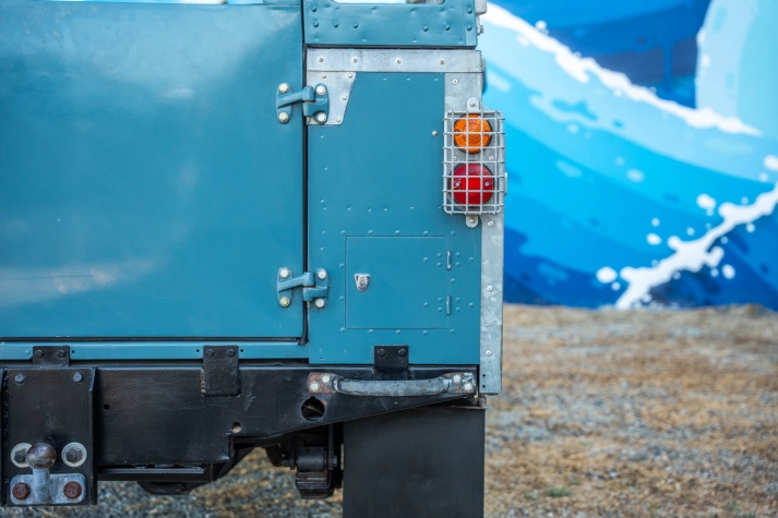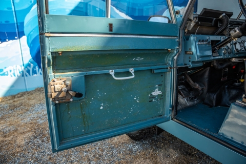 The truck is finished in blue and was repainted at an unknown time. It has a vented tropical roof with alpine windows as well as auxiliary lights, a folding windshield, a side-hinged rear cargo door, cowl vents, sliding side windows, and dual side mirrors. Close-up photos of the exterior are provided in the gallery below.