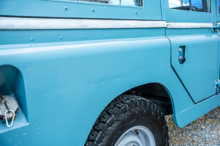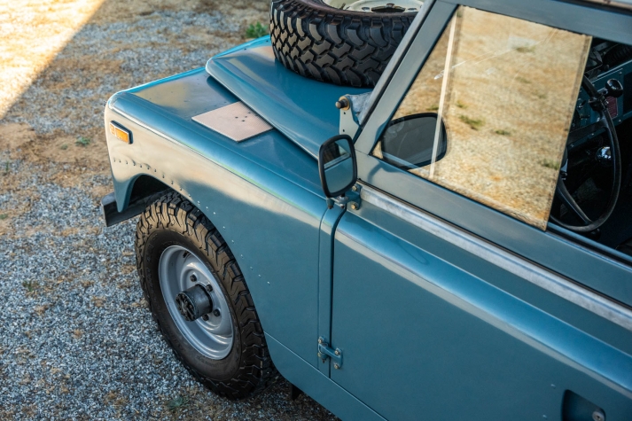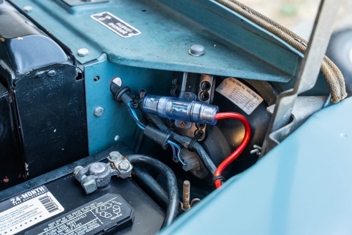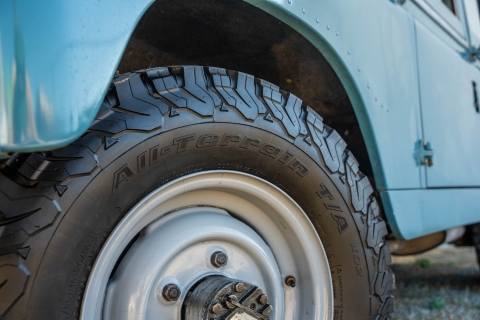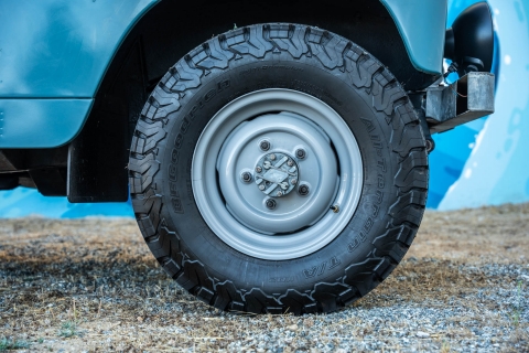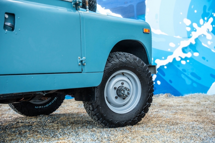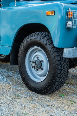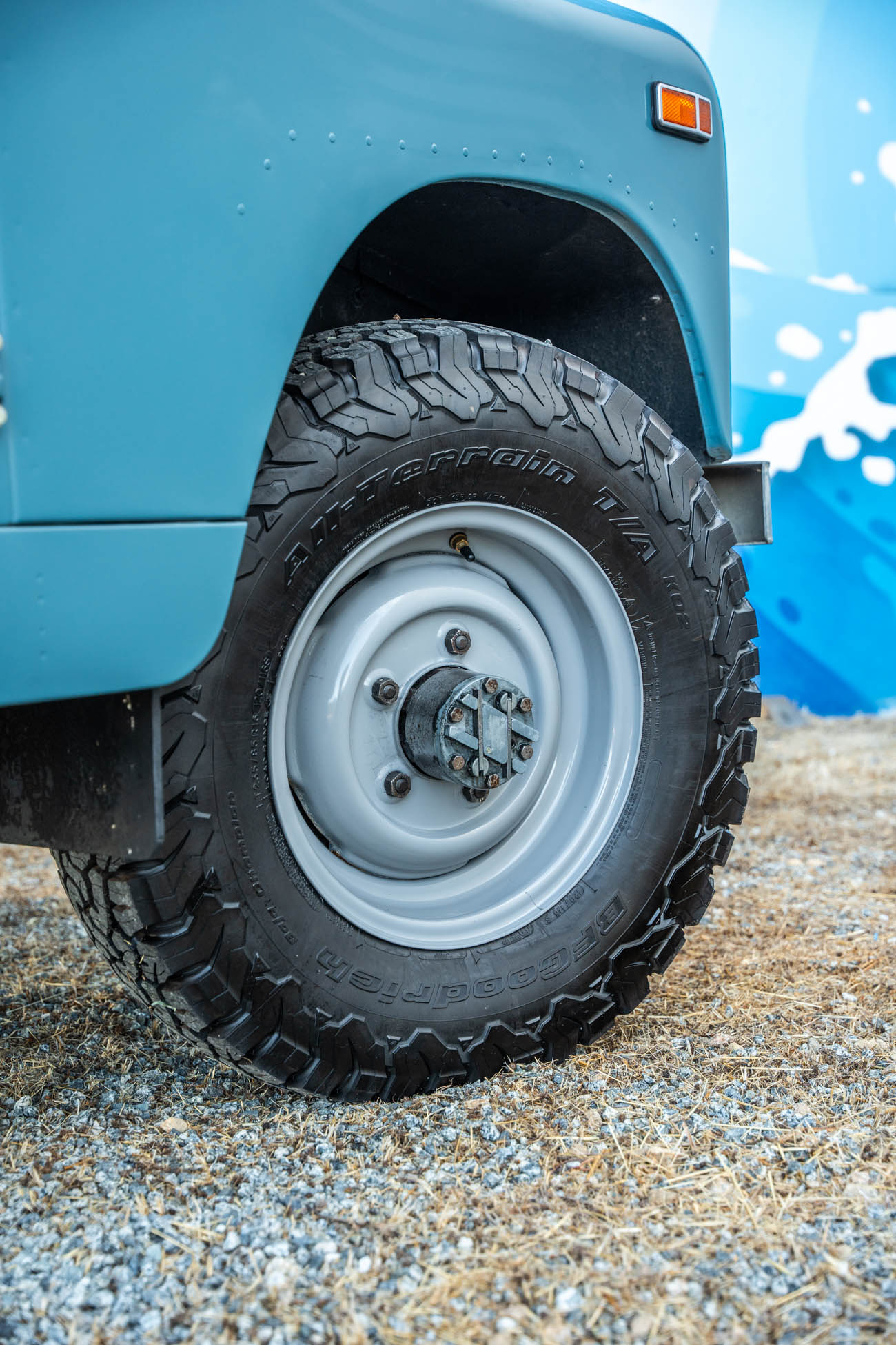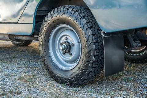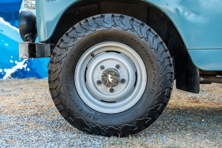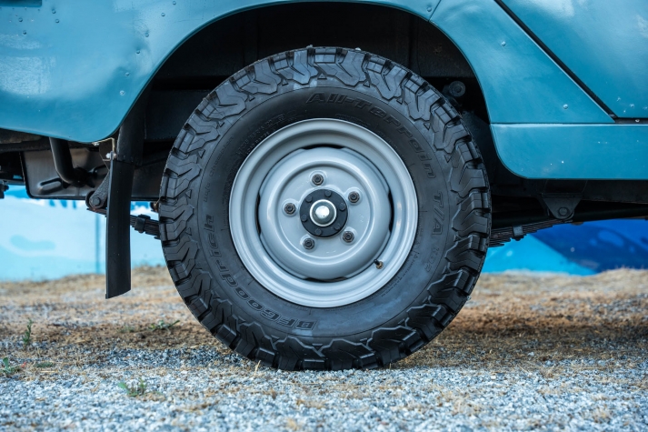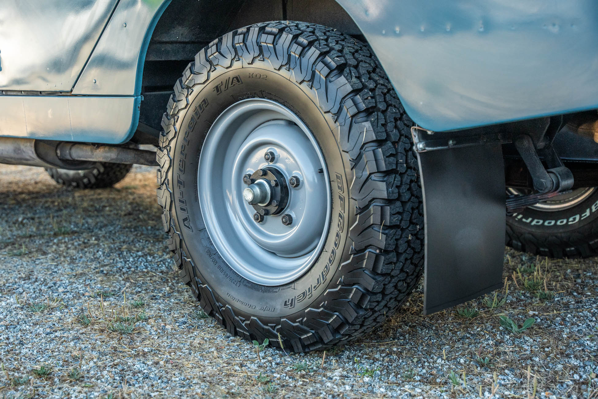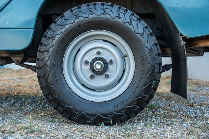 The 16? slotted steel wheels were refinished and powder-coated in late 2023, at which time a new set of 235/85 BFGoodrich All-Terrain T/A KO2 tires were mounted. A spare is secured to the hood. Braking is handled by four-wheel drums.