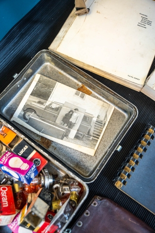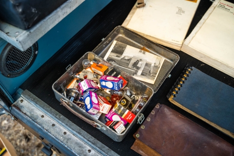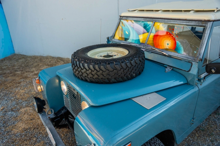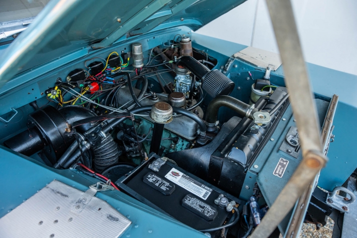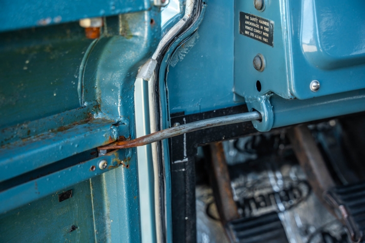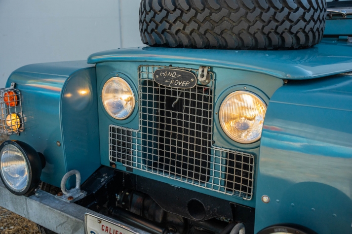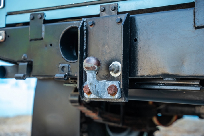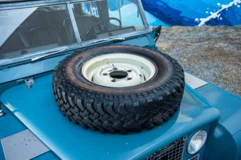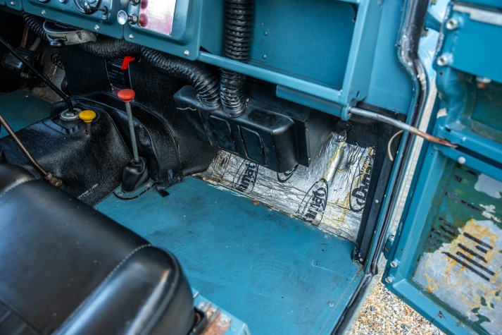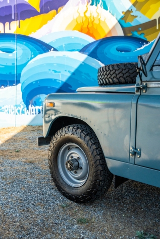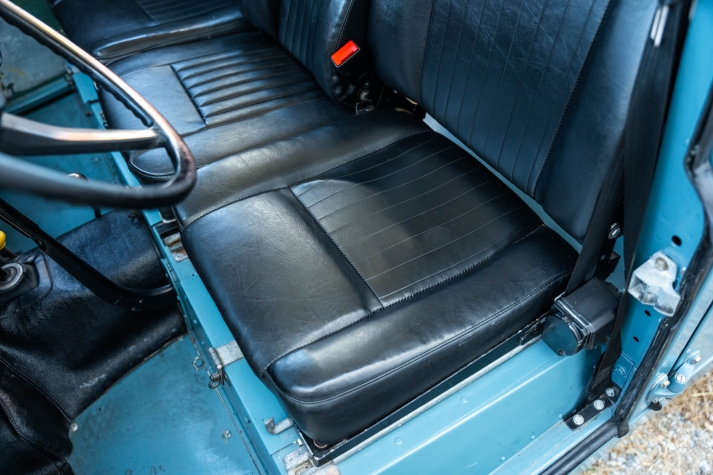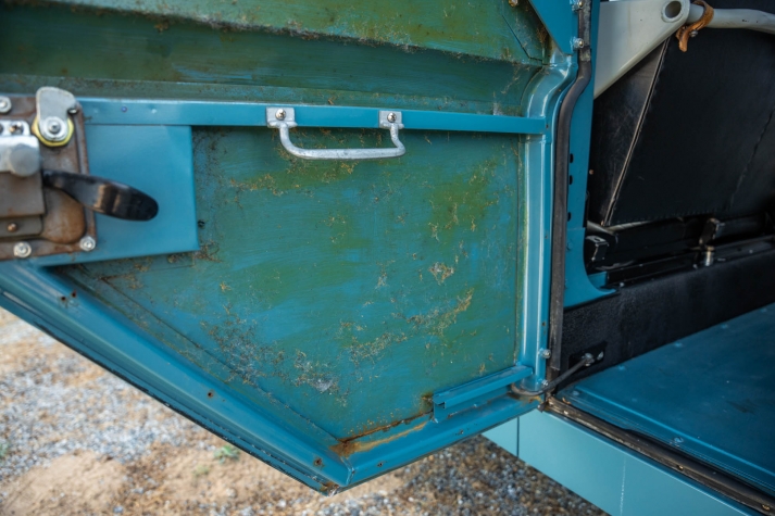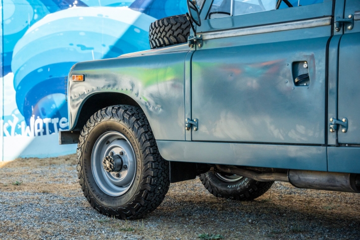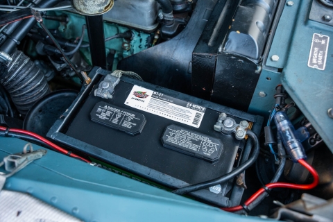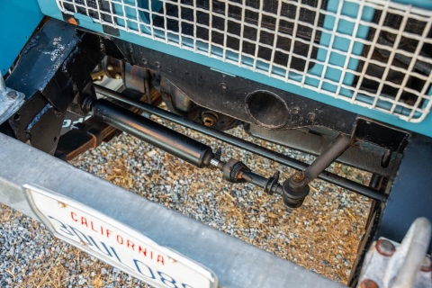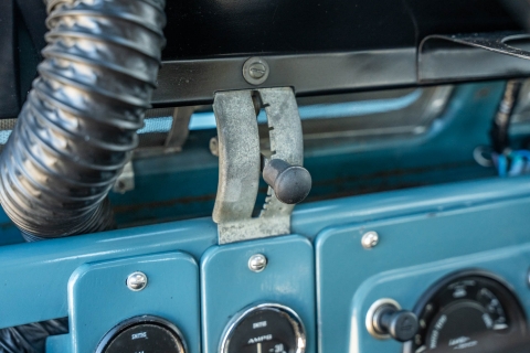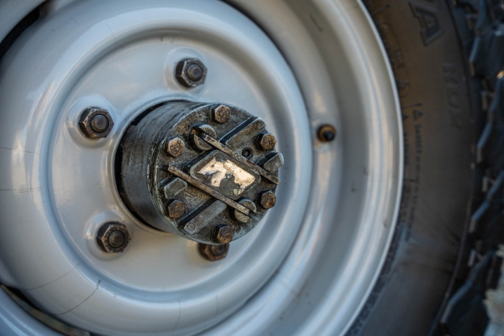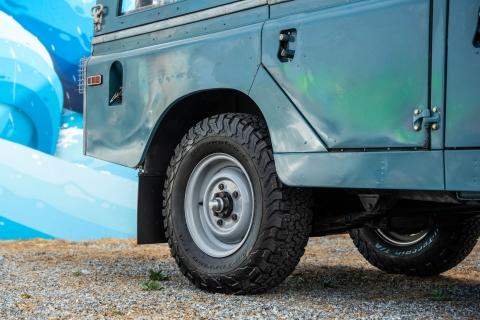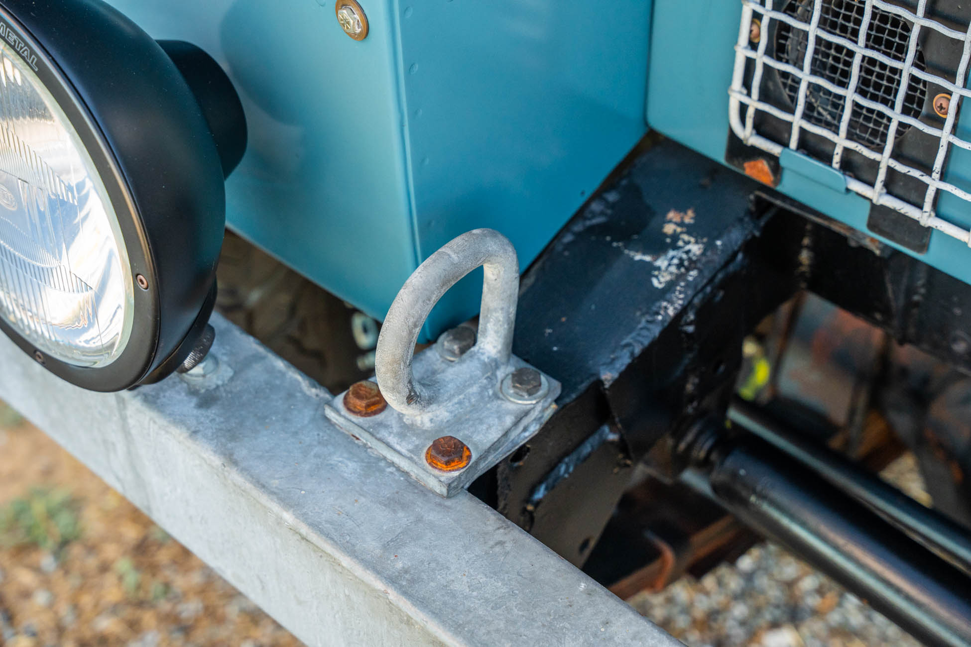 The 16? slotted steel wheels were refinished and powder-coated in late 2023, at which time a new set of 235/85 BFGoodrich All-Terrain T/A KO2 tires were mounted. A spare is secured to the hood. Braking is handled by four-wheel drums.