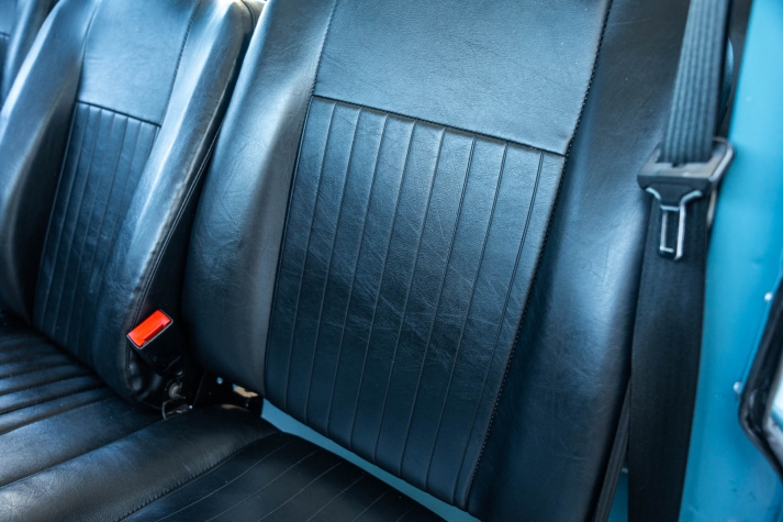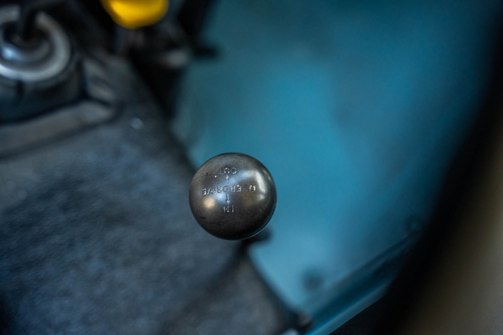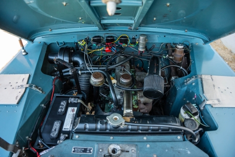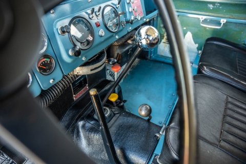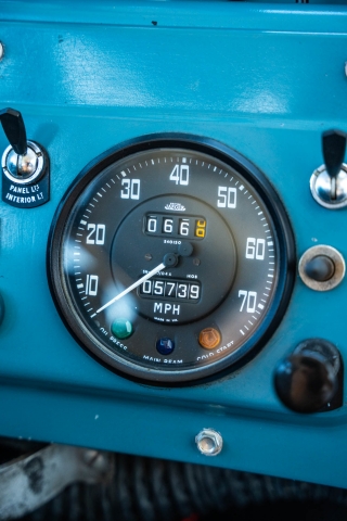 The three-spoke steering wheel features a brodie knob and fronts Jaeger instrumentation including a 75-mph speedometer and gauges for water temperature and fuel level. Auxiliary readouts are positioned to the left. The fuel gauge wiring was repaired in December 2018. The horn and the oil pressure gauge do not work. The five-digit odometer shows 6k miles, approximately 1k of which were added under current ownership. Total mileage is unknown.