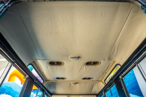 The three-across front seats, second-row bench, and rear jump seats are trimmed in black vinyl.