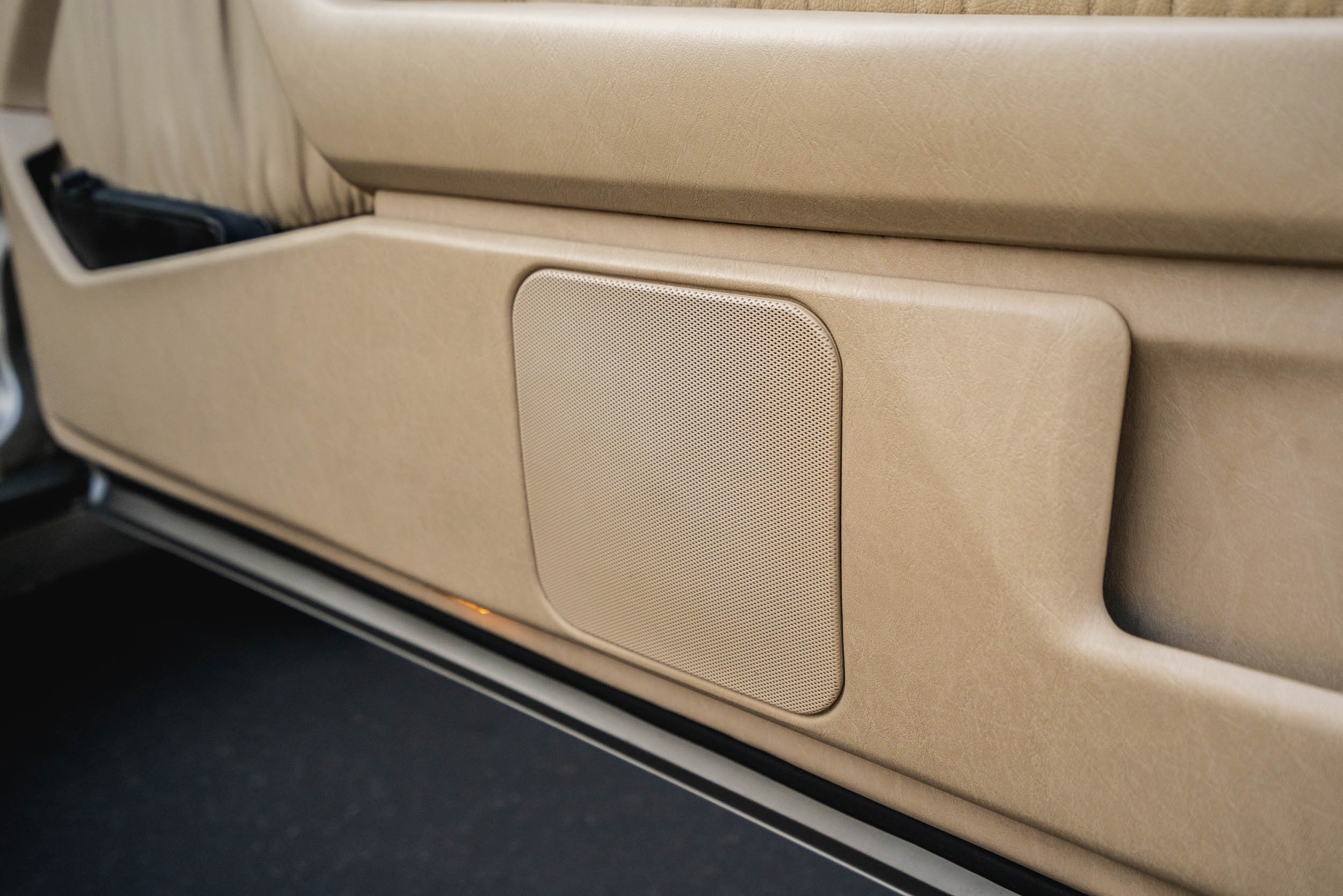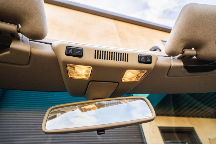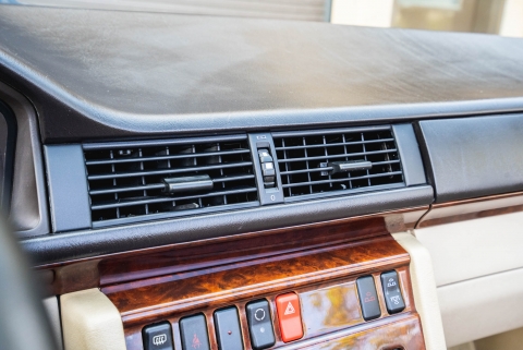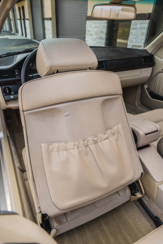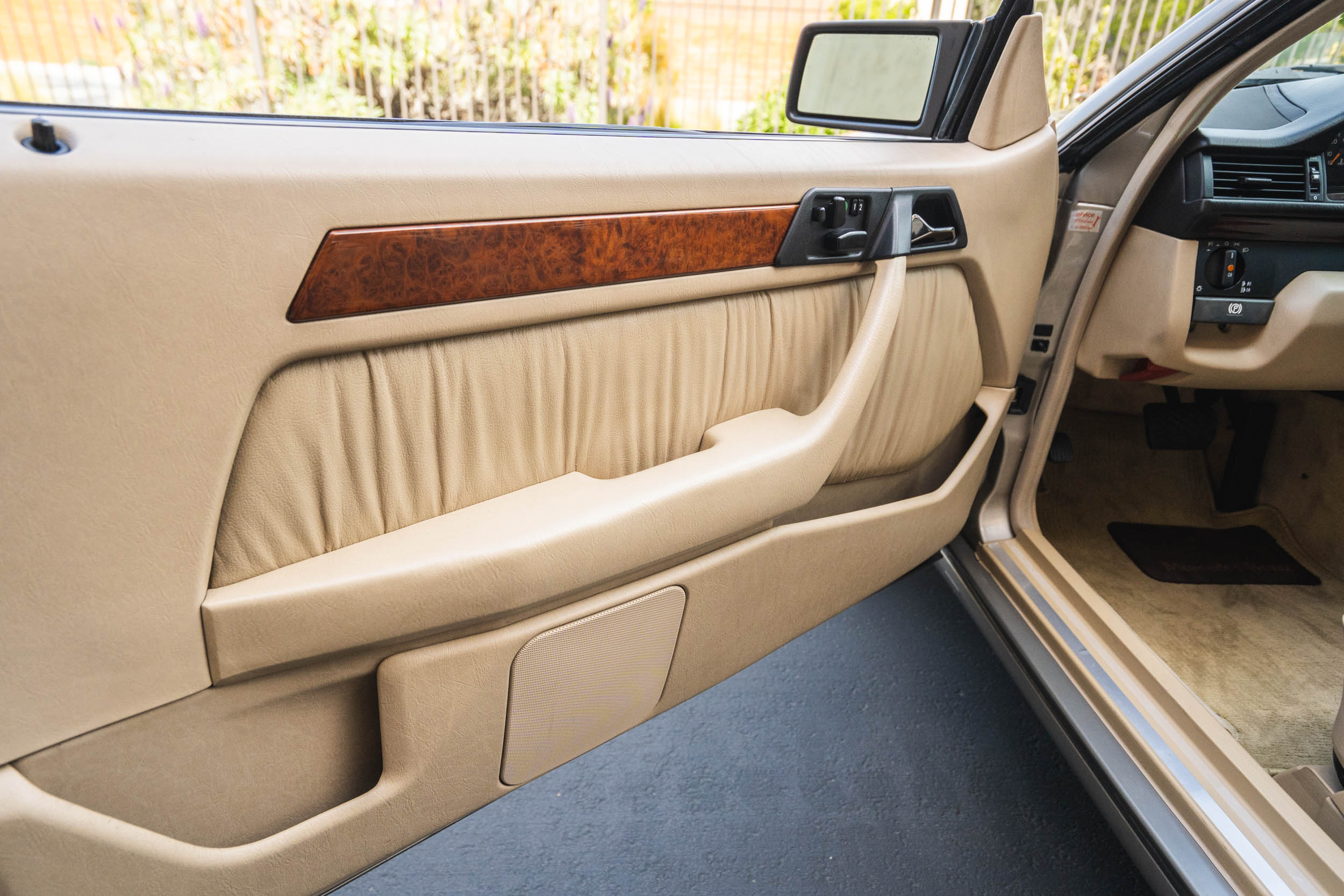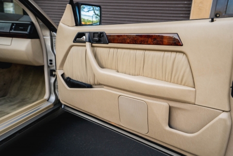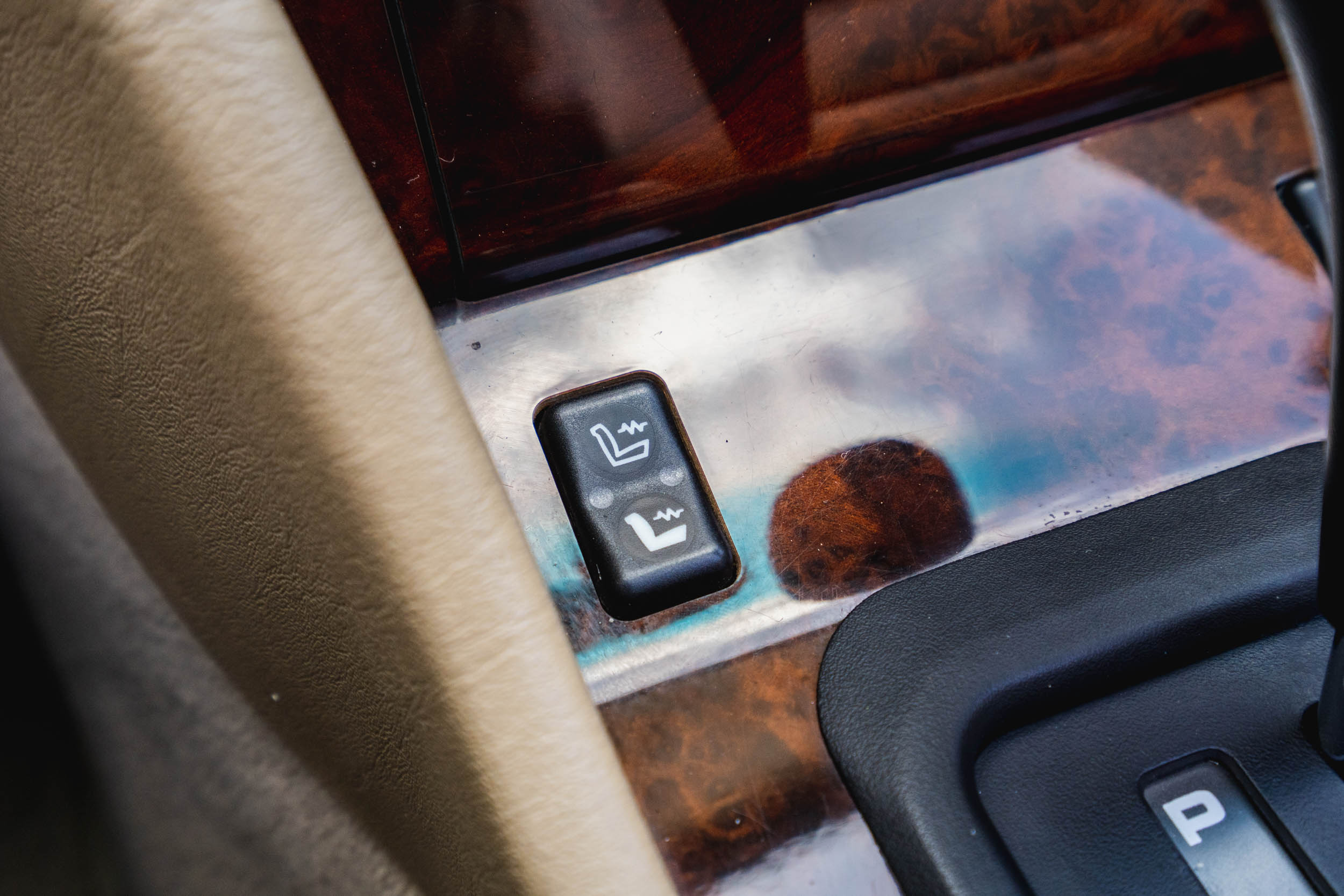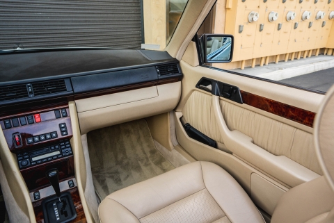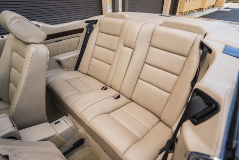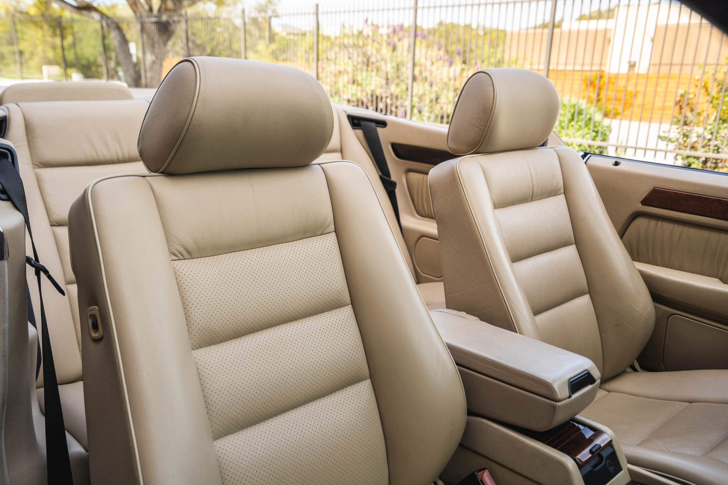 The heated and power-adjustable front seats are upholstered in beige leather, accompanied by a color-coordinated dashboard, center console, door panels, and carpets. Additional appointments include burl wood trim, automatic climate control, cruise control, a rear wind deflector, power windows and locks, dual airbags, power-operated rear headrests, and a factory cassette stereo.