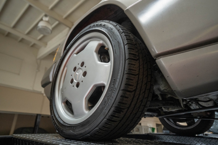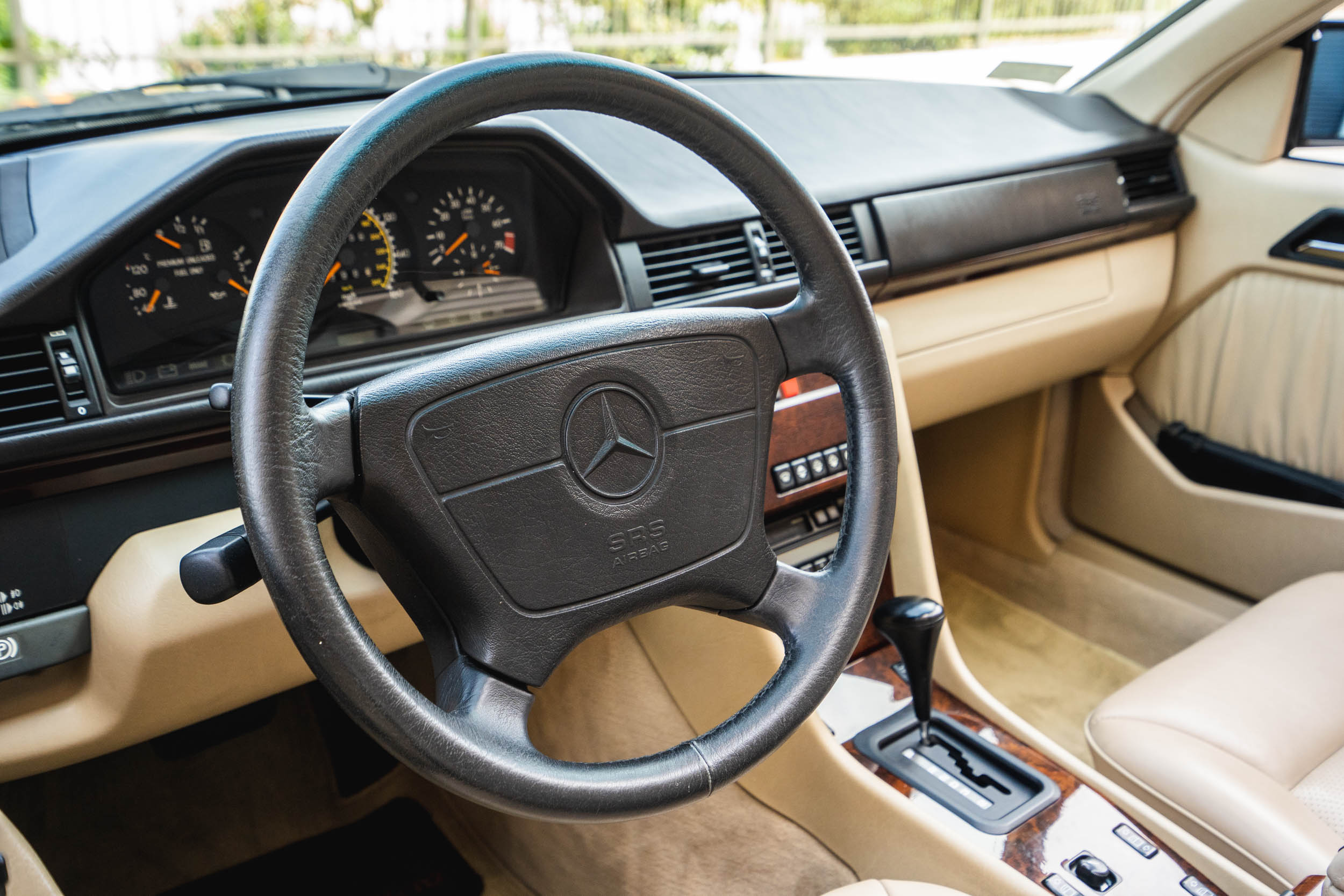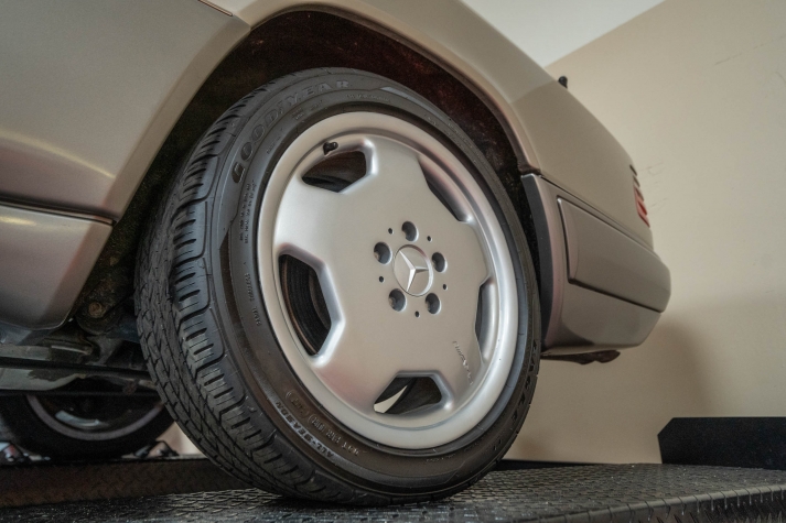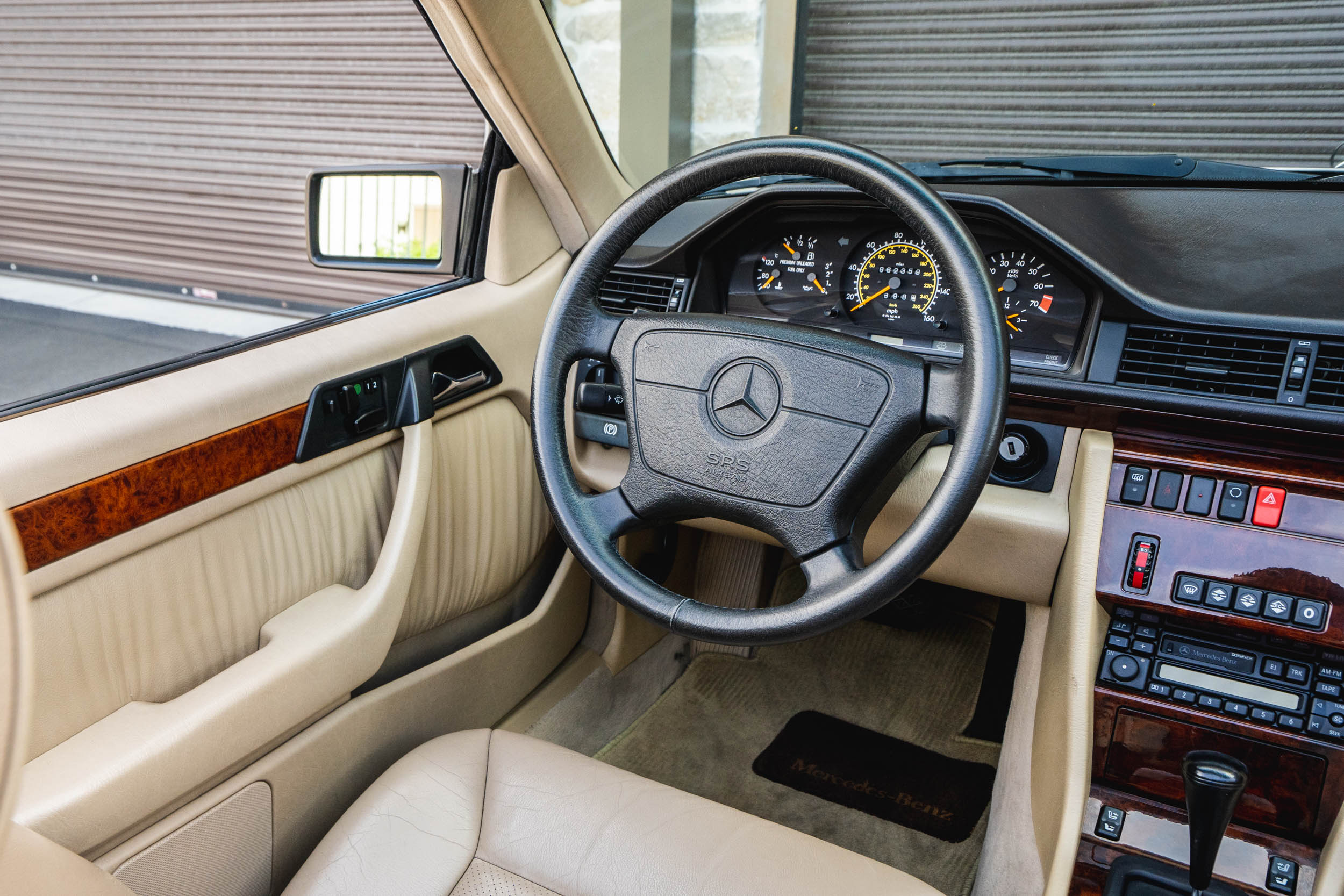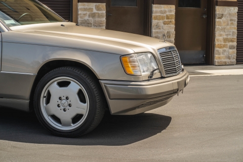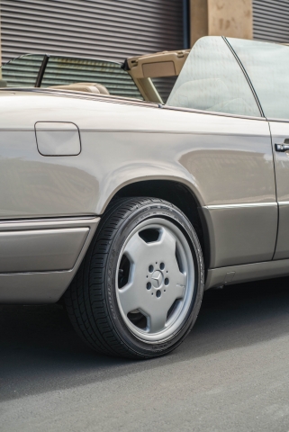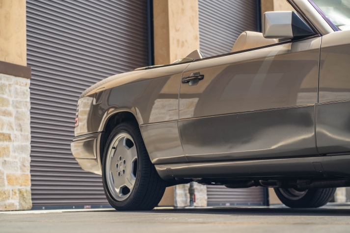 This 1995 Mercedes-Benz E320 cabriolet is powered by a 3.2-liter M104 inline-six paired with a four-speed automatic transmission, and it is finished in Smoke Silver Metallic over beige leather upholstery. The car was registered in Illinois and North Carolina before it was acquired by the current owner in a November 2019 BaT auction, and it was subsequently relocated to California. Equipment includes a power-operated black soft top, automatic climate control, cruise control, 17? AMG Monoblock wheels, anti-lock disc brakes, headlight wipers, heated and power-adjustable front seats, and a factory cassette stereo. This A124 E320 cabriolet shows 62k miles and is now offered on dealer consignment with manufacturer’s literature, removed wheels, a clean Carfax report, and a California title.