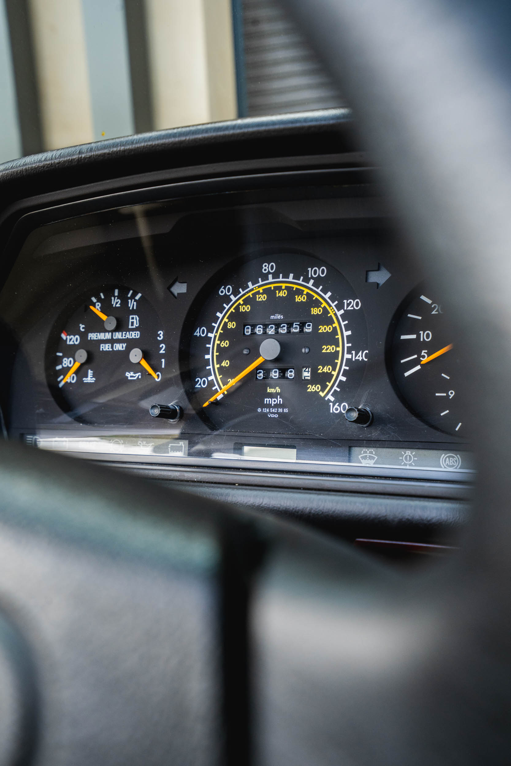 The leather-wrapped steering wheel fronts VDO instrumentation consisting of a 160-mph speedometer, a tachometer, an analog clock, and auxiliary gauges. The six-digit mechanical odometer shows 62k miles, approximately 3k of which were added under current ownership.