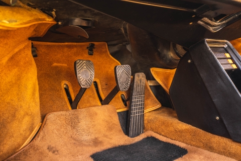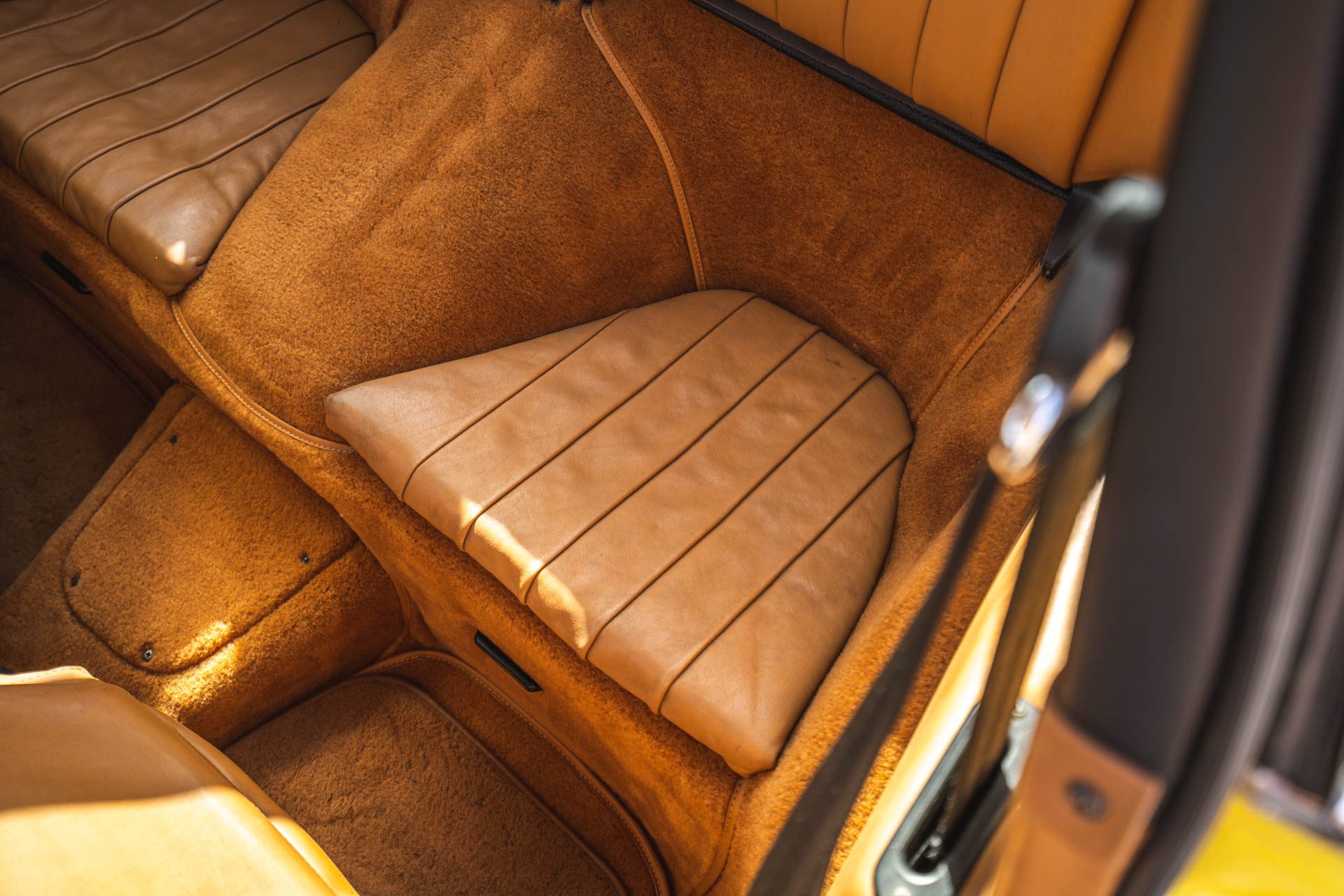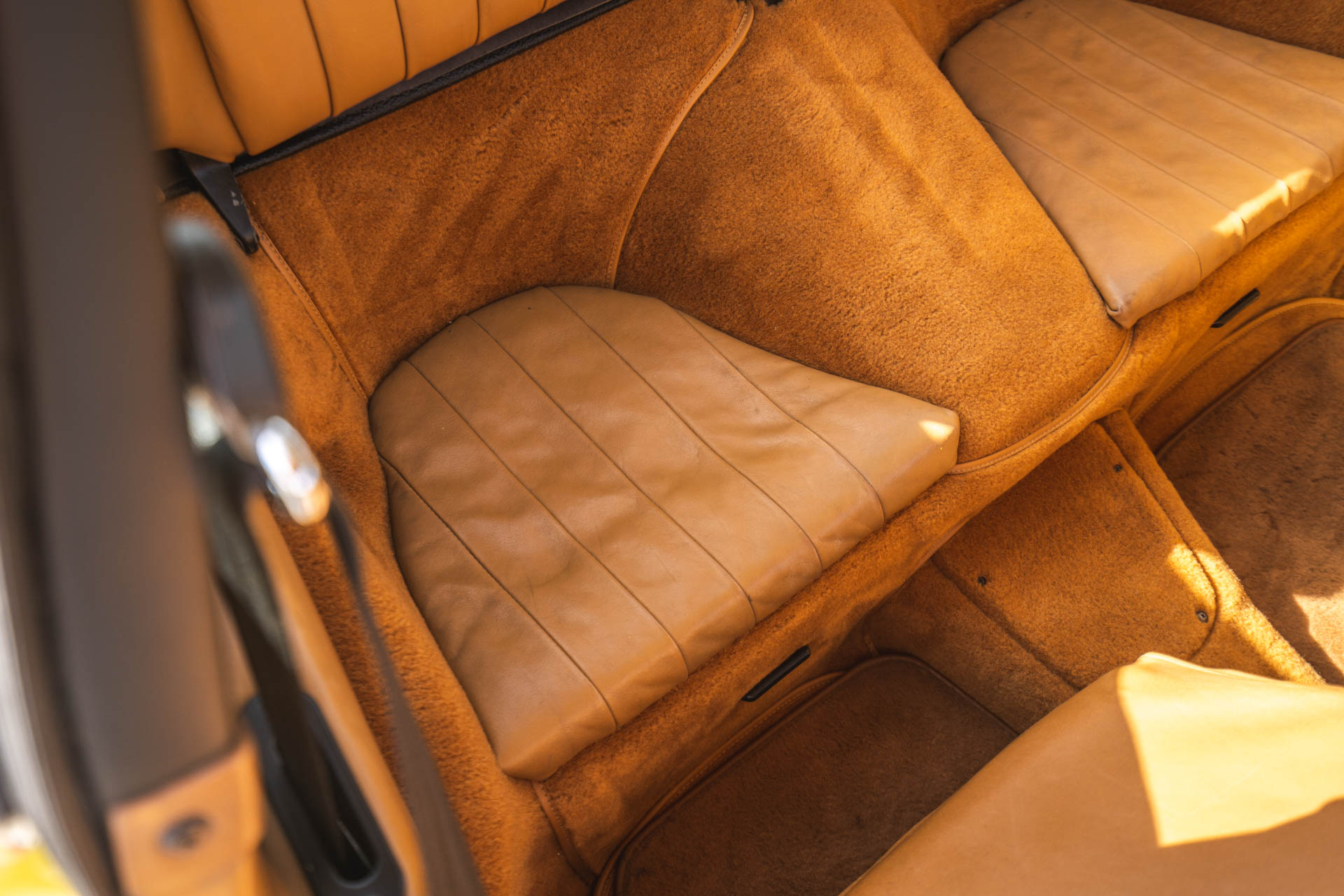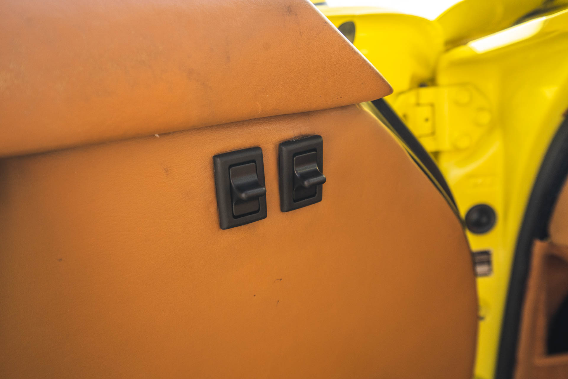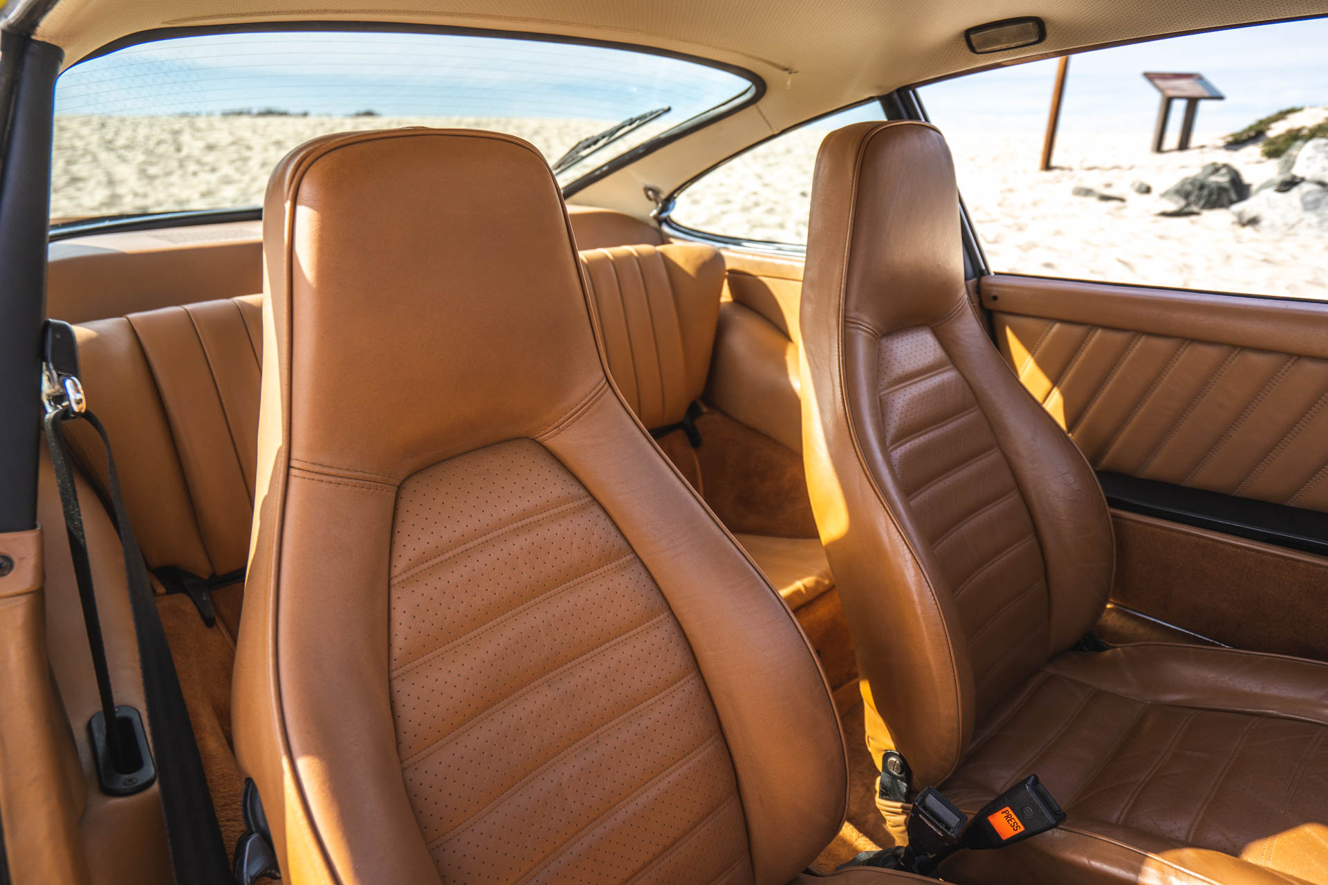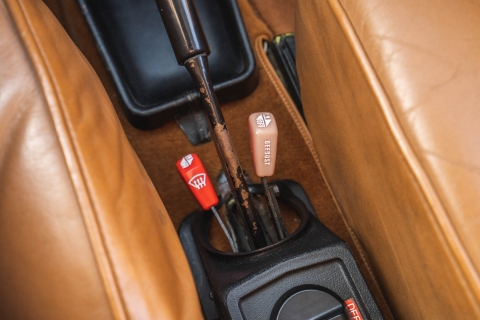 The cabin features seating surfaces upholstered in Cinnamon leather along with a color-coordinated dashboard and door panels. Interior features include power windows and air conditioning. The center console houses a cassette-tape storage console, although the car is equipped with a blanking plate in place of a head unit.