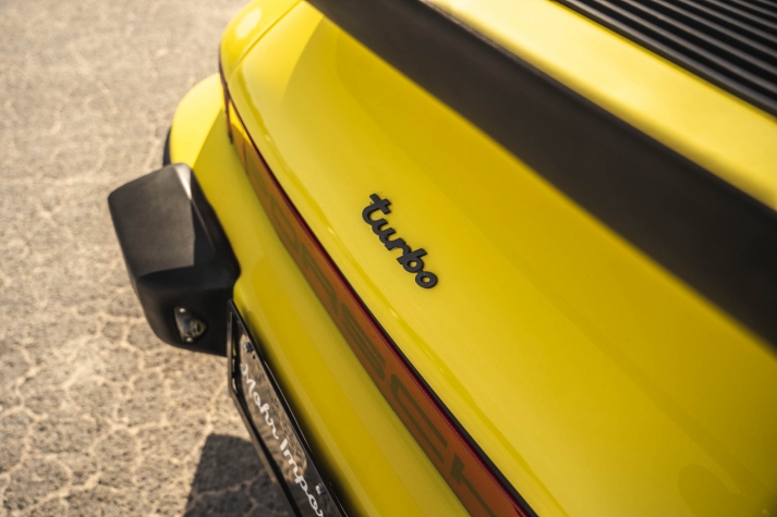 The car is finished in Light Yellow (L117) and features a sunroof, headlight washers, dual side mirrors, rear fender stone guards, rear bumperettes, a front spoiler, “Turbo” rear badging, and a rear spoiler. The selling dealer notes evidence of paintwork, and the fog lights and rear-window wiper do not work.
