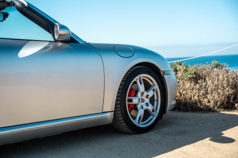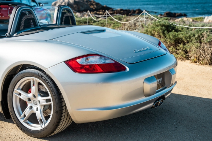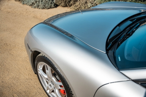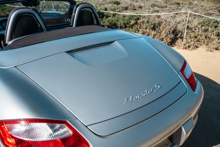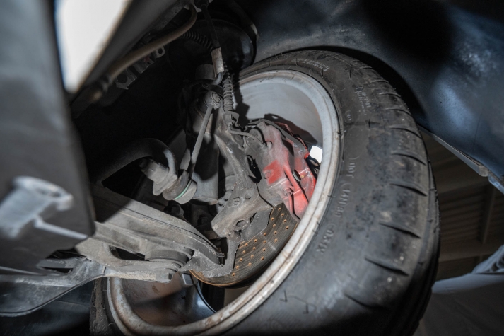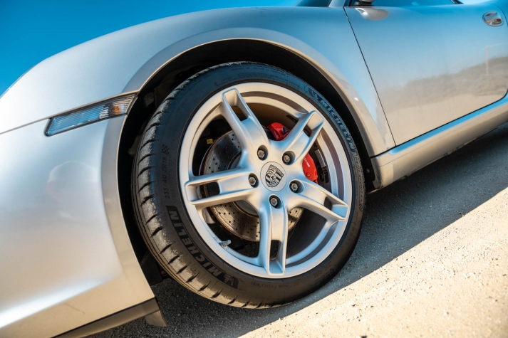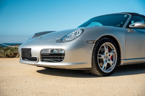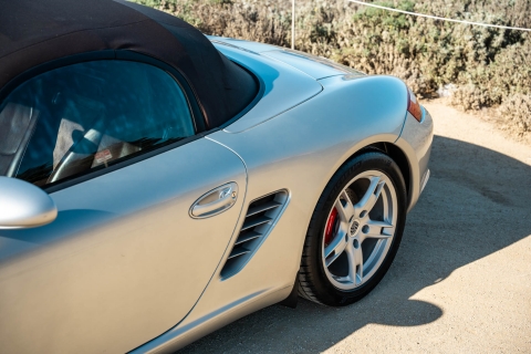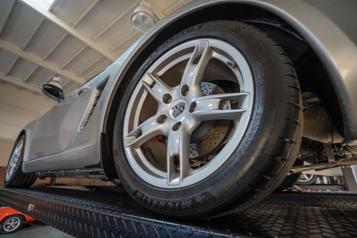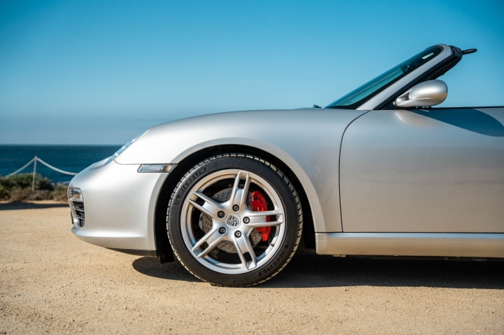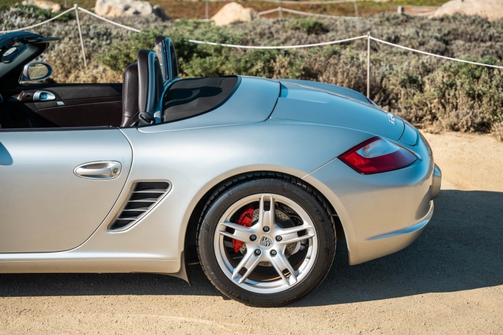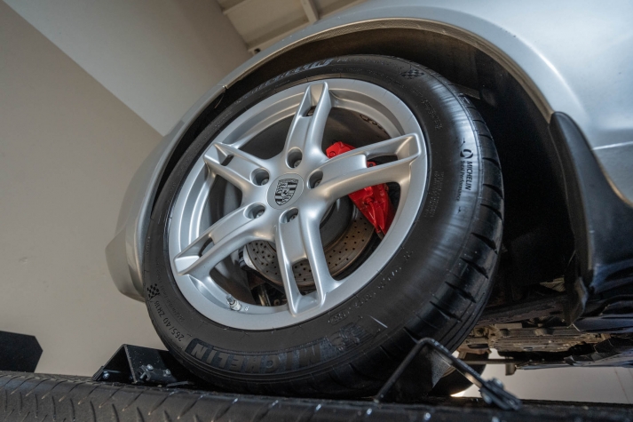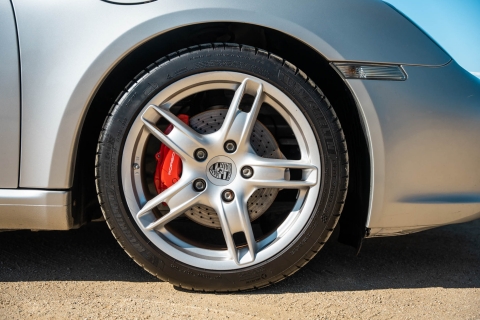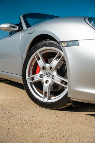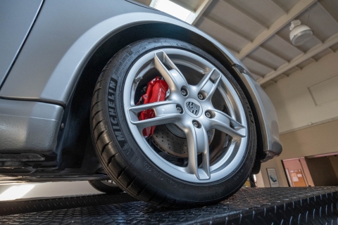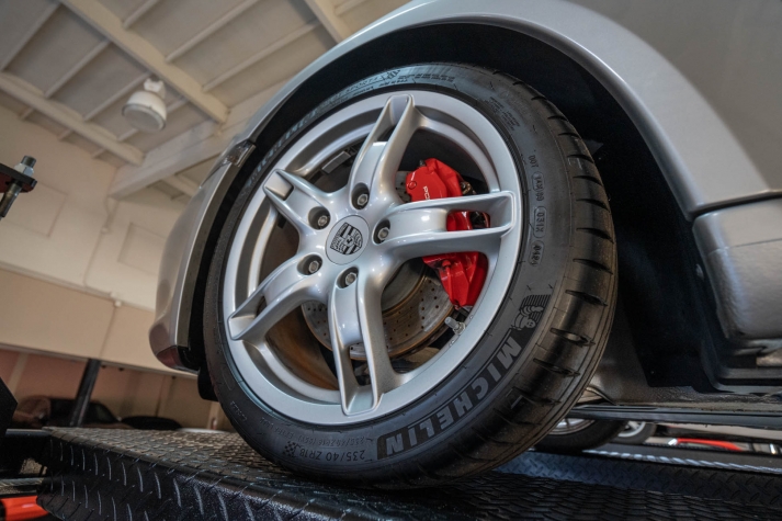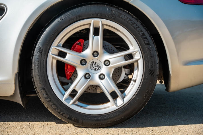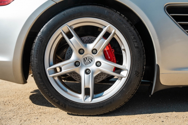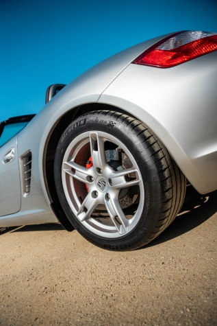 The 18? Boxster S wheels were mounted with Michelin Pilot Sport 4s tires in 2024, and they measure 235/40 up front and 265/40 out back. The car is equipped with Porsche Active Suspension Management (PASM) and Porsche Stability Management, and braking is handled by four-piston Porsche-branded calipers over cross-drilled rotors measuring 12.5? and 11.8? front and rear, respectively. The brake fluid was changed in 2024.
