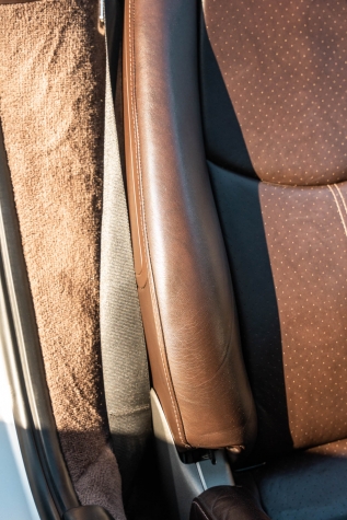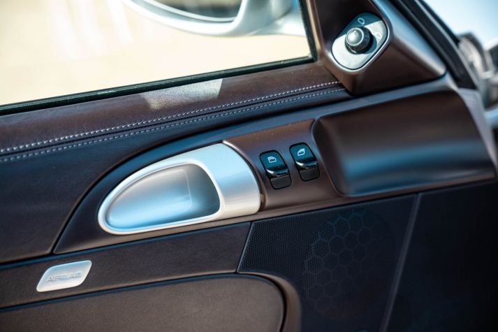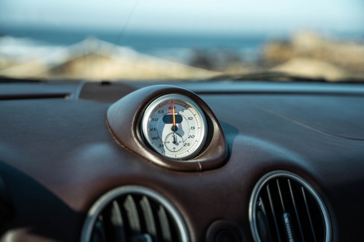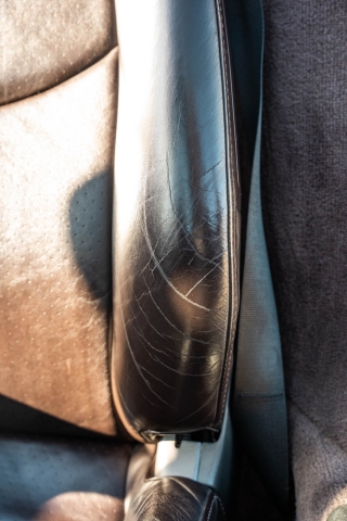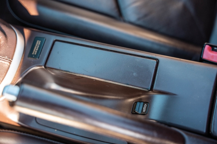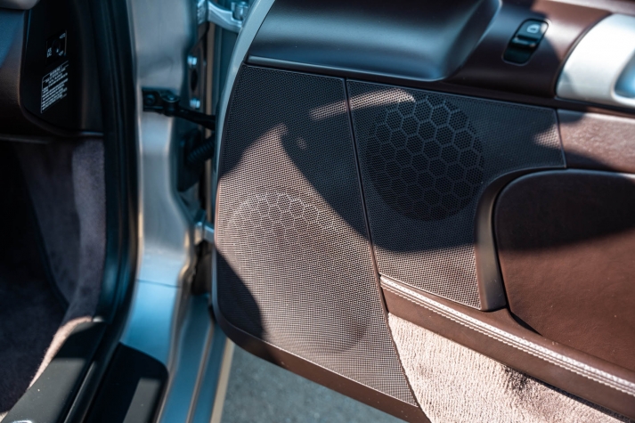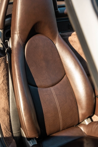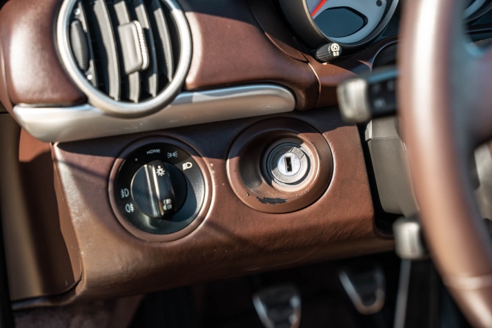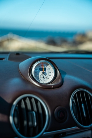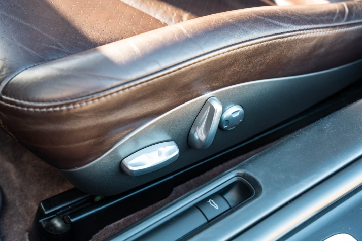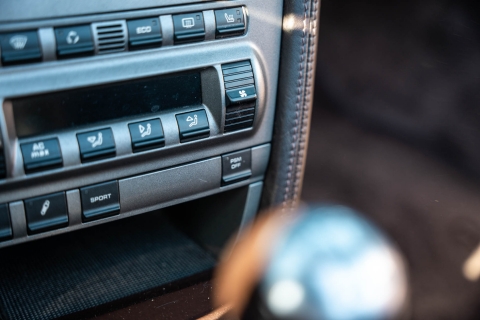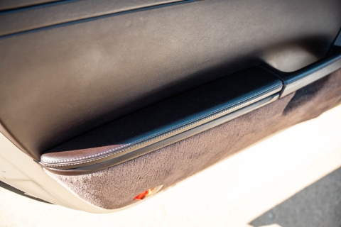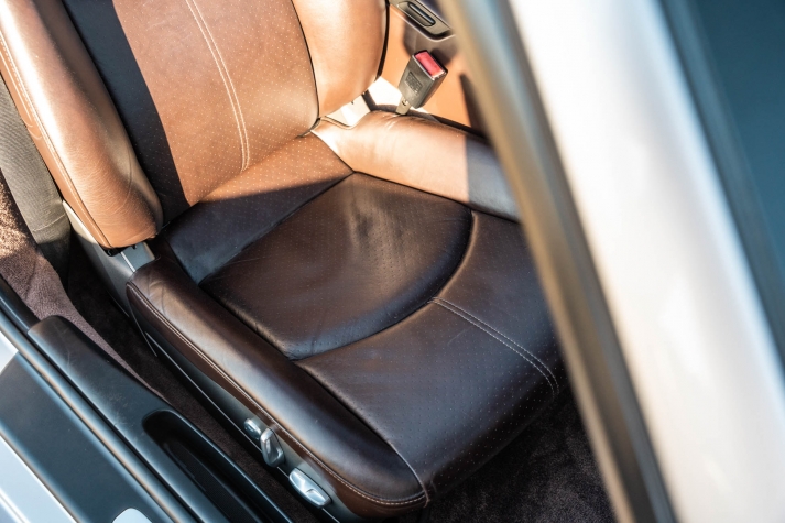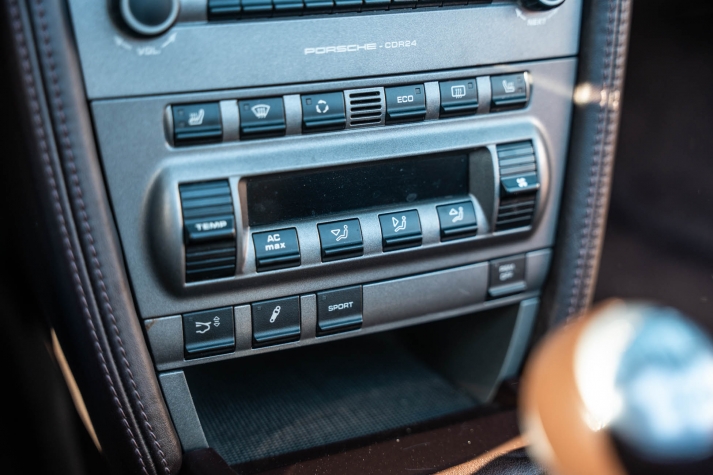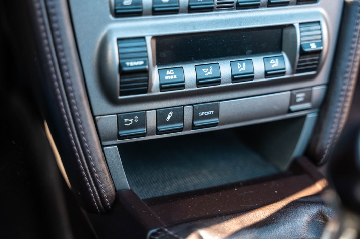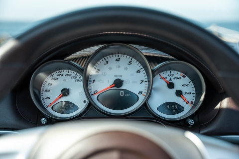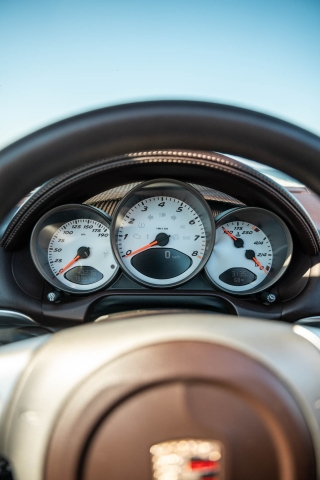 The leather-wrapped steering wheel frames a central 8k-rpm tachometer, a 190-mph speedometer, and gauges for fuel level and coolant temperature. The Sport Chrono Package added a stopwatch atop the dash. The digital odometer indicates 40k miles, approximately 2k of which were added under current ownership.