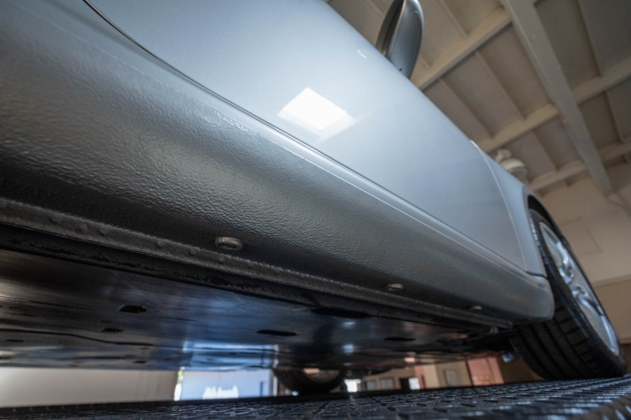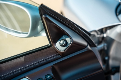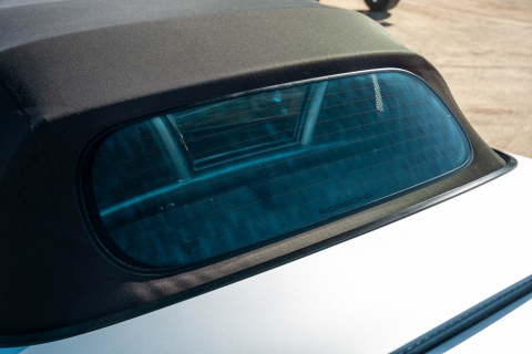 The car is finished in Arctic Silver Metallic (92U) and features a power-operated Cocoa convertible top. Additional equipment includes silver-accented quarter panel intakes, body-color roll bars, a speed-dependent rear spoiler, and dual exhaust outlets. Paint meter readings are provided in the gallery.